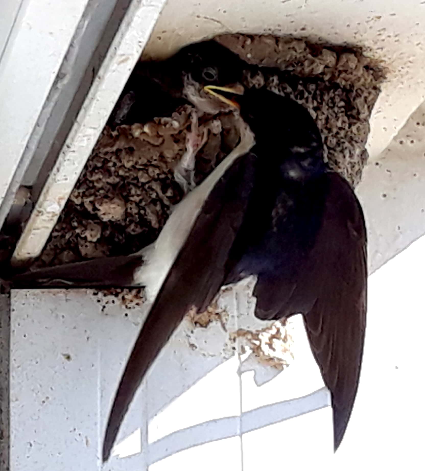 Je voulais vous faire part d'une observation que je fais depuis 7ans que je reviens vivre en semaine chez ma mère pour le travail, j'ai 2 nids d'hirondelles aux coins de ma fenêtre de chambre ils sont occupés chaque année...mais cette année les hirondelles sont arrivées avec au moins 2 semaines de retard sur les années précédentes, de ce fait des moineaux ont essayé d'investir ces nids, ils ont échoués et au passage ils ont cassé un des nids. Les hirondelles ont investi le nid restant et je suis ravi de vous annoncer 2 naissances. Je vous envois quelques photos dont une becquée dont je suis plutôt fier.
