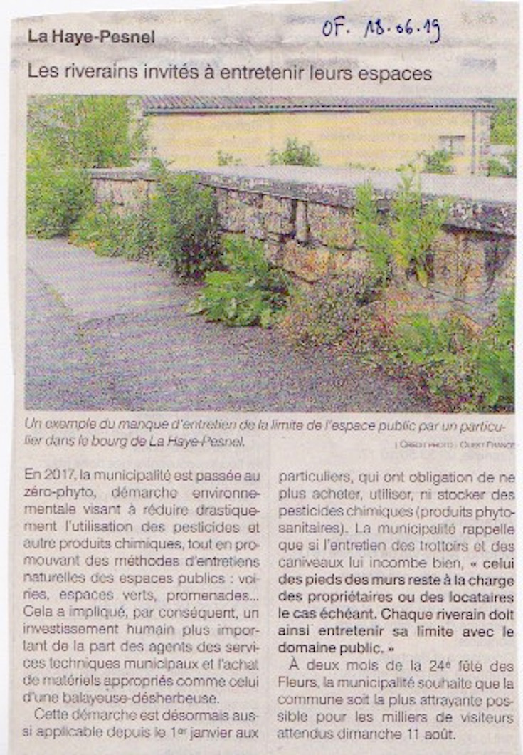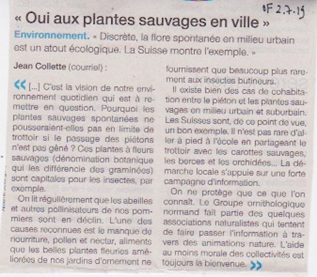 La commune de la Haye-Pesnel (Manche) organise depuis 24 ans une "fête des fleurs". Mais pas n'importe quelles fleurs : il faut un passeport pour avoir un droit d'entrée sur les chars... Un article paru dans le quotidien Ouest-France m'a paru mériter un avis adressé au courrier des lecteurs. "Manque d'entretien" est une formule typique du 20e siècle quand goudron, pelouses et gravillons étaient la base de l'aménagement urbain. Le courrier était accompagné de quelques photos prises à Lausanne pour exemple de cohabitation entre les piétons et la végétation spontanée. Le message est bien passé dans la rubrique du courrier des lecteurs, mais sans photos et un peu tronqué (la commune visée n'est pas citée, on ne fâche personne ainsi.) Seule consolation, le GONm est cité dans une rubrique qui couvre toute la zone de publication de Ouest-France! (même si les herbes folles des trottoirs ne paraissent pas immédiatement du "ressort" du GONm, ce qui est faux : lors du quadrat vieille ville d'Avranches, les verdiers étaient abonnés à un trottoir "sauvage" jusqu'à ce que l'herbicide fasse table rase.)