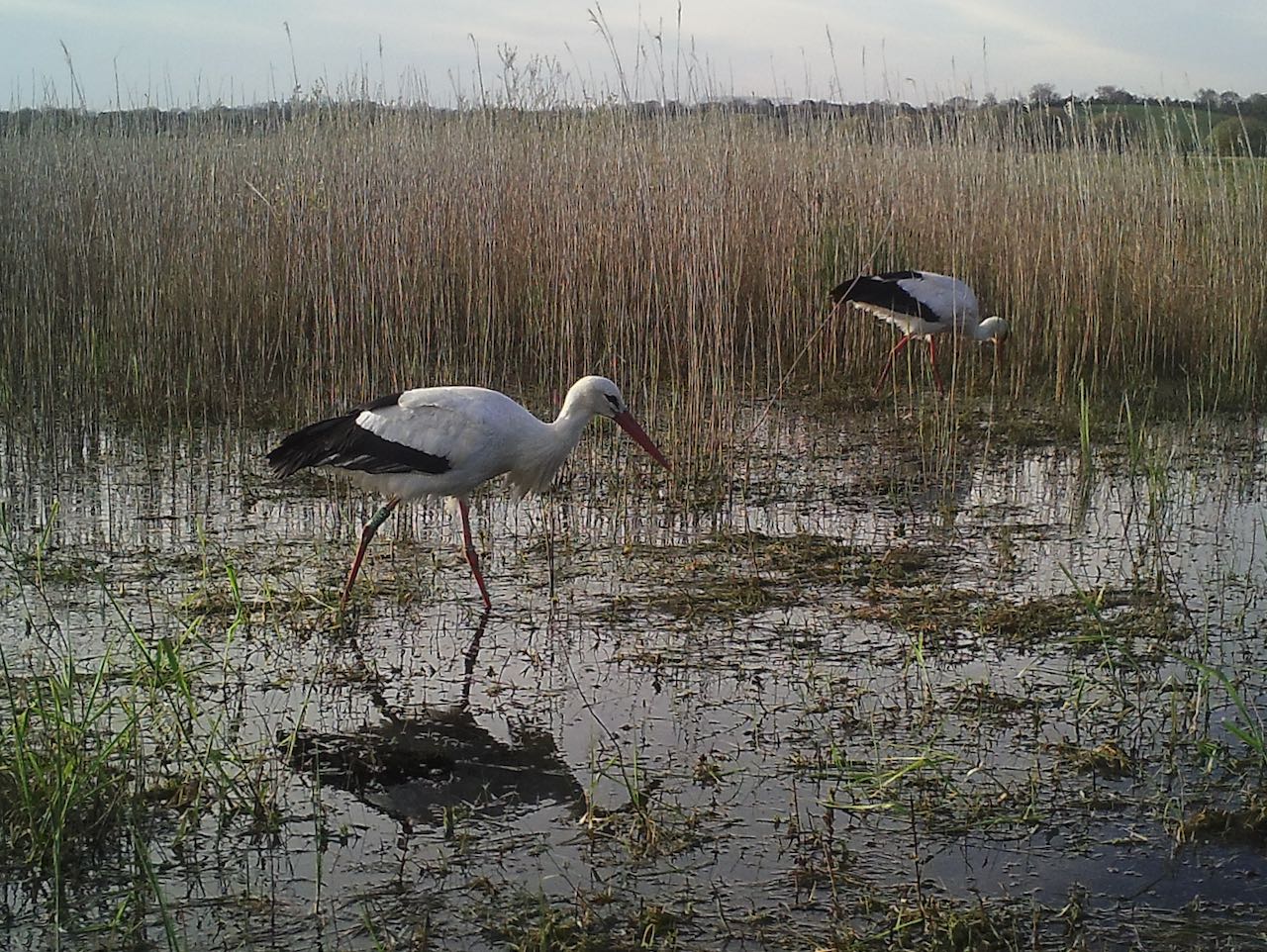 Maeva me tient au courant des suivis qu'elle effectue sur nos réserves. Les premières bergeronnettes flavéoles prennent possession des Défends. Grâce au piège-photo, le 9 avril ce beau mâle est presque identifié mais il y a 2 possibilités : nous vous tiendrons au courant s'il vient à nouveau se faire tirer le portrait, la bague positionnée sous un autre angle permettant de lire plus de chiffres. Si le butor étoilé est absent sur les réserves (mais aussi aux Ponts d'Ouve et ailleurs sur le PNR, ainsi qu'aux dernières nouvelles au marais du Hode), la marouette ponctuée est présente au Cap, ainsi que 4 mouettes rieuses ayant des velléités d'installation. Sur Pénême, 2 cigognes blanches arpentent la zone d'étrépage dont une baguée en 2018 à Crossac en Loire-Atlantique : future nicheuse ! Au Cap, les travaux automnaux semblent porter leurs fruits. La parcelle de l'ouest est bien en eau sur 10 ha et la différence de niveau des 2 échelles limnimétriques étalonnées ente elles, l'une dans la réserve et l'autre sur le réseau général, montre bien les effets des aménagements effectués : le niveau d'eau est supérieur de 42 cm à l'intérieur de la réserve.