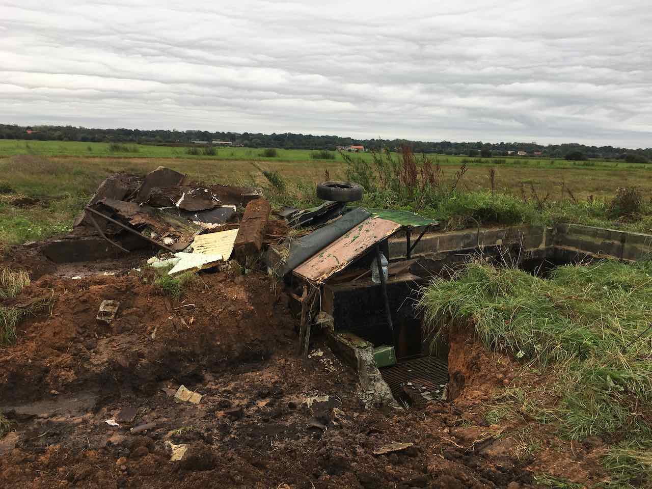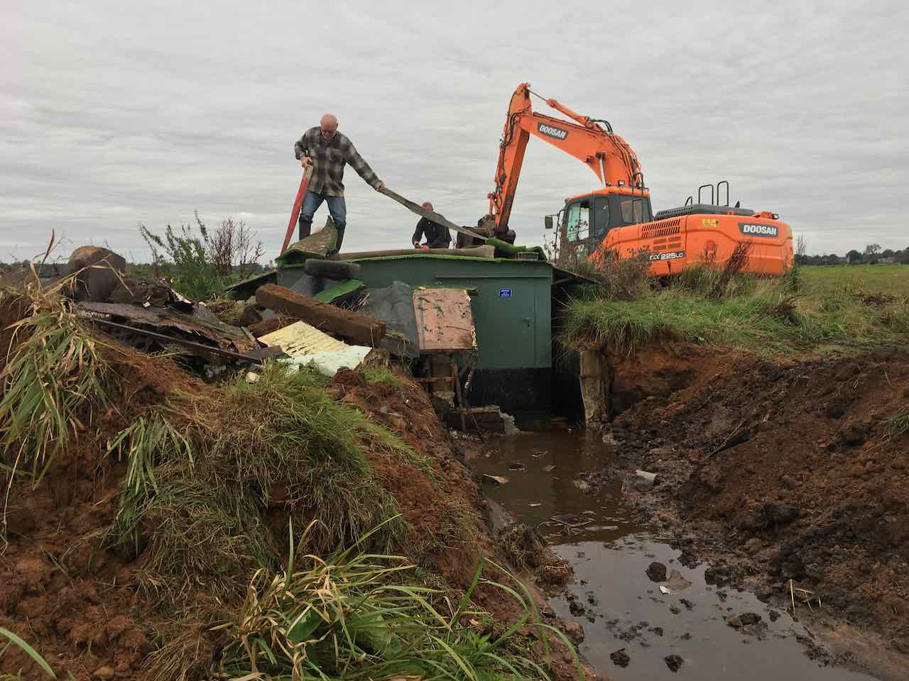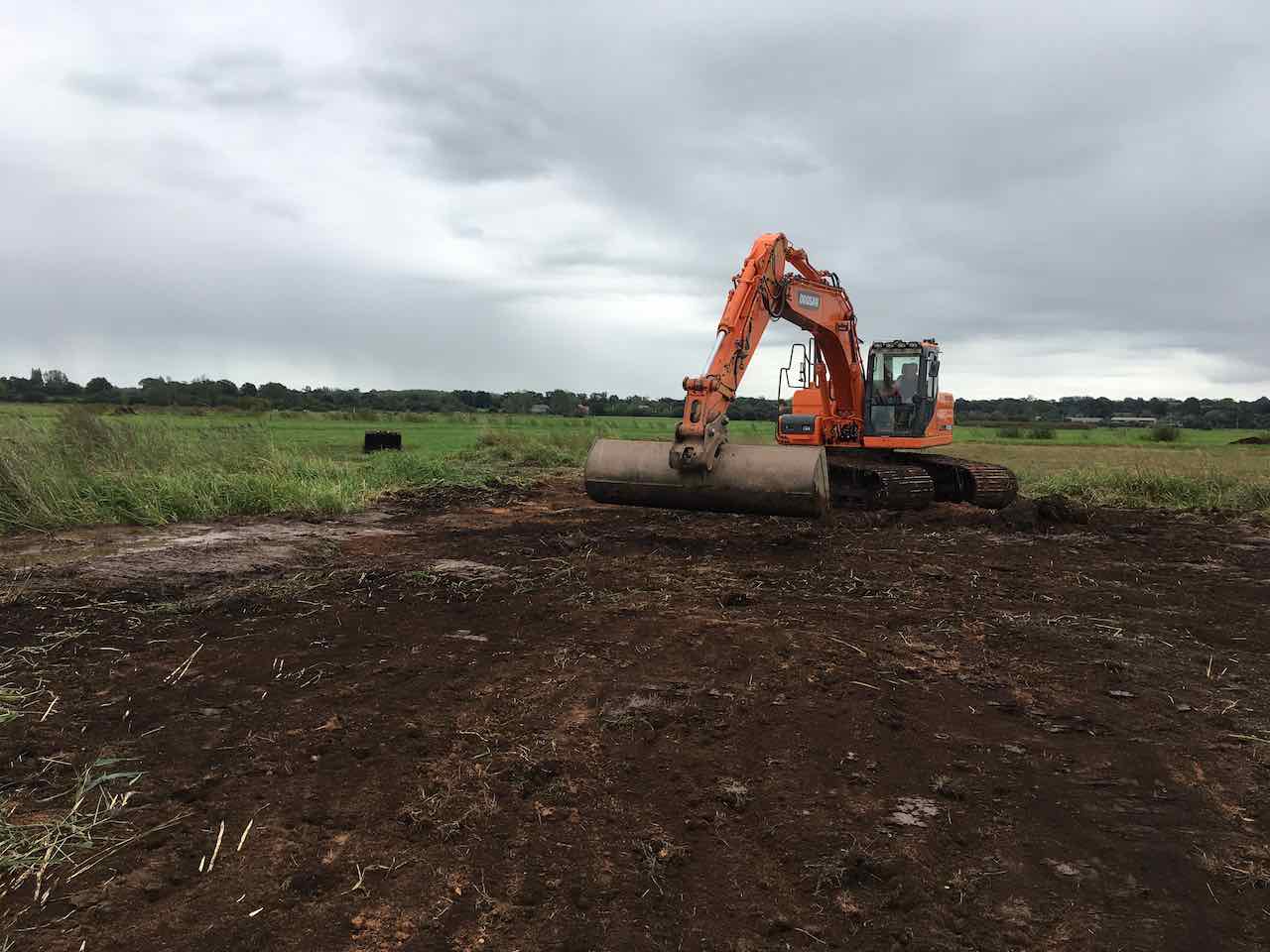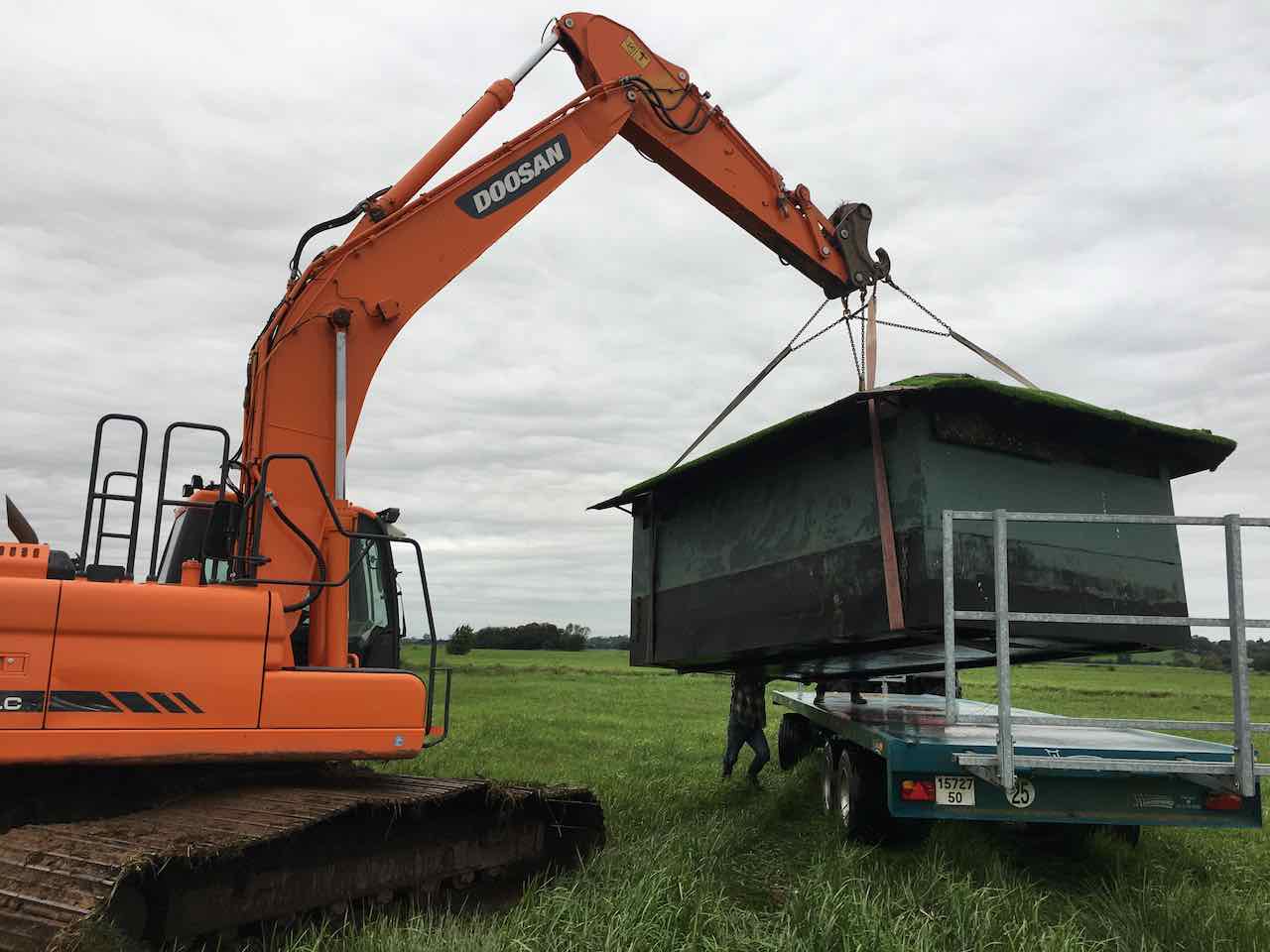Il s'agissait d'évacuer la hutte de chasse, d'une remise en état des abords de la hutte et de la mare. L'évacuation des gravats et matériaux divers (plusieurs dizaines de sacs à huitres, parpaings, palettes, bois, ...) ont nécessité pas moins de 7 remorques chargées à ras bord. Le sol gorgé d'eau n'a pas facilité le travail Le décapage de surface dans la mare après évacuation des gravats : le sol est laissé volontairement à nu en espérant que les Phragmites australis présents en bordure se développent La remise en état du pourtour de la hutte. La terre en surplus est déplacée pour réhausser le sud de la parcelle qui est grévé d'un droit de passage aux propriétaires riverains, et déposée en divers endroits destinés à boucher certains fossés dans la but de mieux gérer les niveaux d'eau à l'aide d'une buse à clapet. Cette pose devrait être effectuée lundi.
