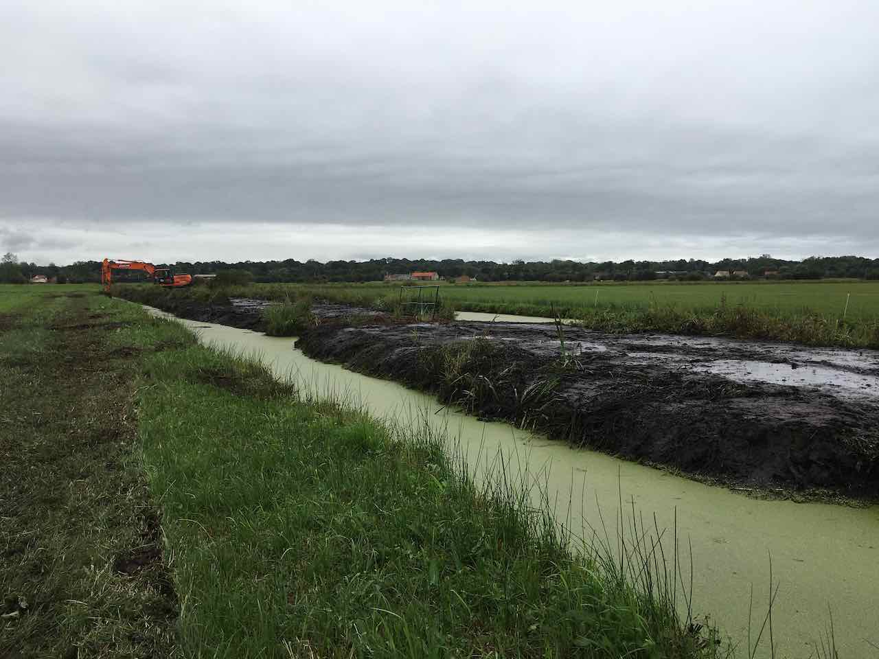 Suite et fin : après la remise en état des abords de la mare du gabion "Anne" et les arrachages de saules jeudi et vendredi dernier, les travaux de ce lundi 7 septembre concernaient du curage et la pose d'une buse à clapet destinée à gérer le niveau interne du nord des Prés de Rotz en s'affranchissant du réseau général géré par l'ASA des marais de la Taute.