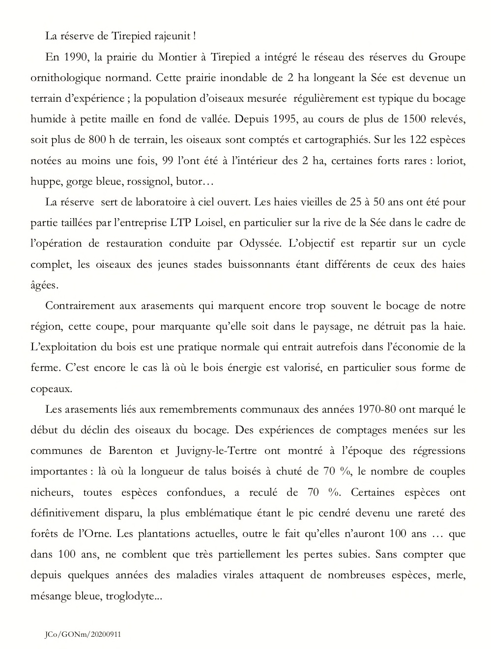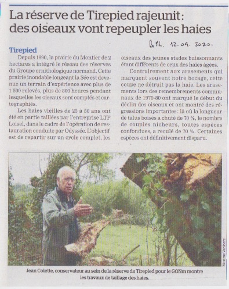 L'incompréhension des objectifs par les riverains implique une explication locale par voie de presse. Il est étonnant de voir avec quelle rapidité l'image du paysage s'imprime dans les esprits sans le recul qui devrait accompagner l'analyse à partir du facteur temps ici capital. Quand j'ai mis en place la haie de jeunes plants par exemple, il n'y avait aucun écran entre le bourg et la vallée, c'était "normal" en 1995. L'abattage actuel est devenu anormal... Précision importante, la haie et la ripisylve vont repousser et la haie large faisant office de barrage par rapport au flot des crues est restée intégralement en place. Un premier article publié par l'hebdomadaire La Manche libre reprend une partie du texte proposé. Le titre est trompeur, il laisse penser que les oiseaux ont abandonné les vieilles haies. Il aurait fallu écrire "de nouveaux oiseaux vont habiter les haies", idée qui est bien exprimée dans le corps du texte.