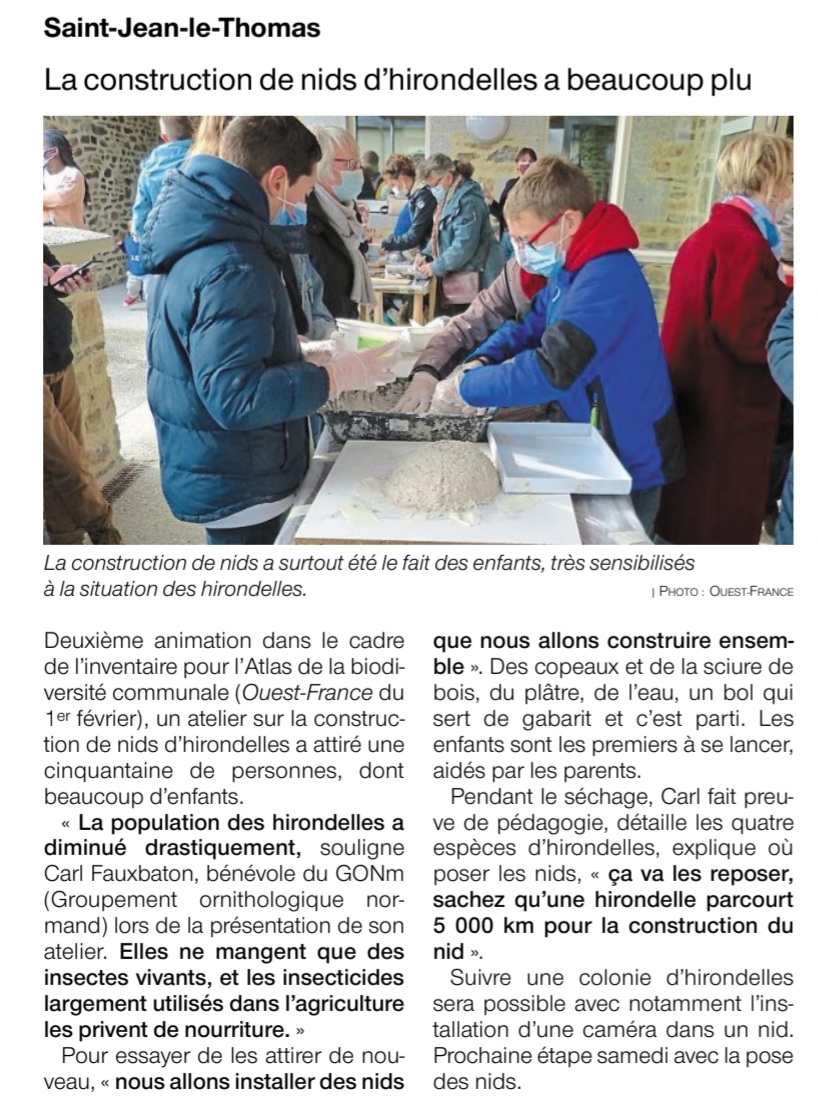 Notre collègue adhérent Carl Fauxbaton a animé un atelier de fabrication de nichoir pour hirondelles à Saint-Jean-le-Thomas, dans le cadre de l' ABC Genêts-Saint-Jean-le-Thomas-Dragey-Ronthon. L'affiliation de Carl au GONm est mentionnée ici. Merci à lui qui a dû gérer un afflux de participants inattendu ou inespéré.