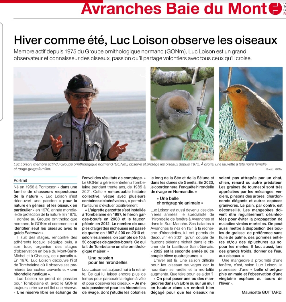 Ce portrait journalistique de Luc rapporte les différents suivis ornithologiques qu'il effectue ou a effectués dans le Sud Manche avranchinais. Son rôle de conservateur de la réserve de Tombelaine passe discrètement alors que l'éviction du GONm de la gestion de cette réserve n'est pas évoquée alors que c'est le sujet d'actualité le plus brûlant du moment.