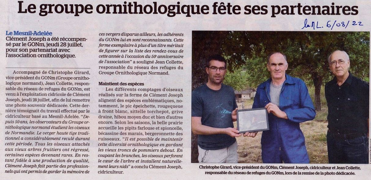Clément Joseph, arboriculteur et cidriculteur, a reçu de la part de Jean Collette et Christophe Girard, représentant le GONm une photographie encadrée de rougequeue à front blanc, en remerciement pour sa longue collaboration avec notre association.