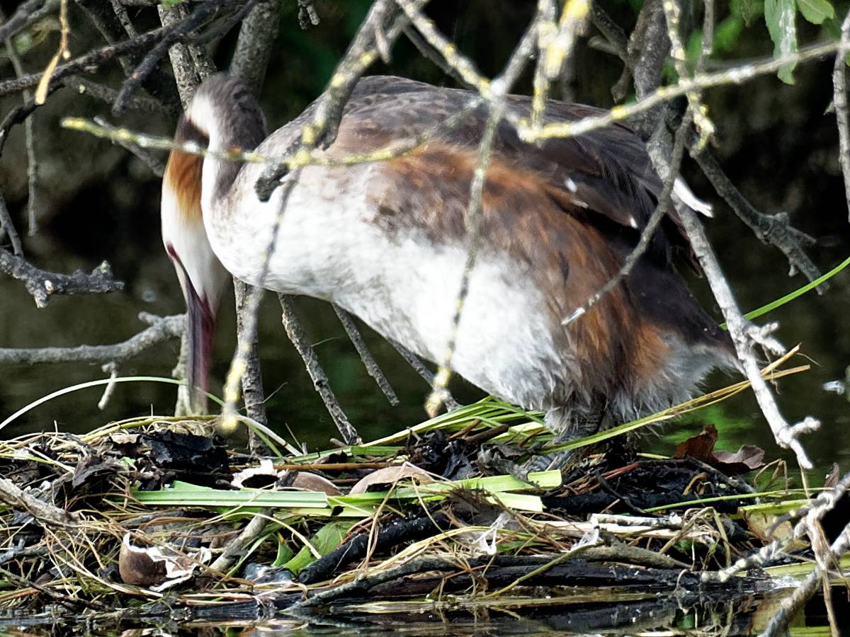 Le 4 Août avec Maryse nous y allons pour compter les oeufs et en trouvons 3, nous découvrons également un deuxième couple de grèbes sur le lac. Le lendemain je réussis à photographier le nid et ses oeufs. Le 12 Août je constate qu'il y a un oeuf cassé au bord du nid et que les 2 autres sont encore intacts. Le deuxième couple de grèbes est toujours présent.