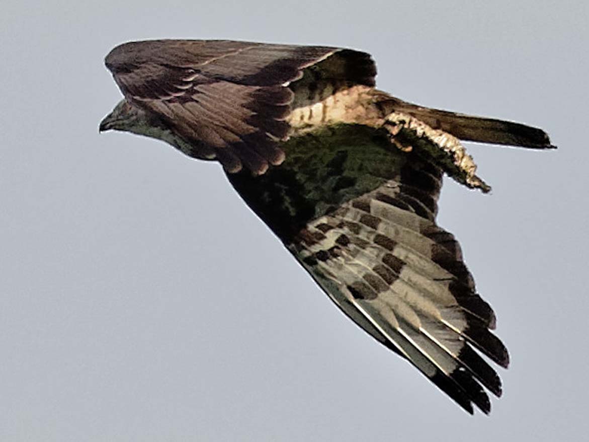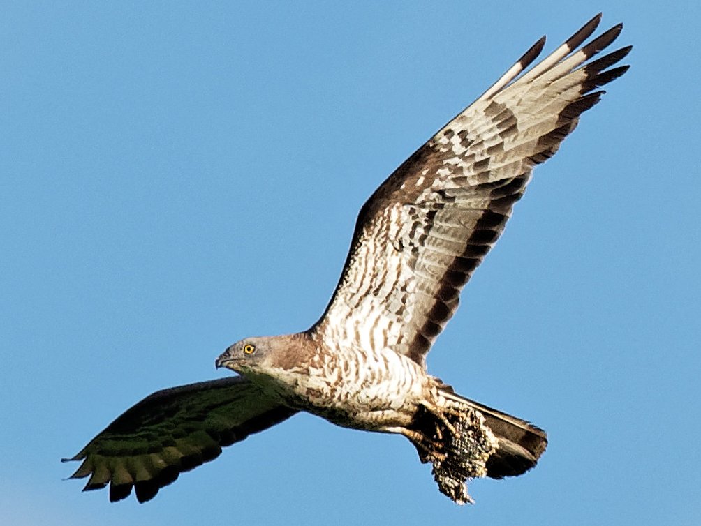 Une Bondrée apivore transportant un beau morceau de nid d'abeilles sauvages a pris la pose pour le photographe. Allait-elle se régaler ou nourrir des petits ?
