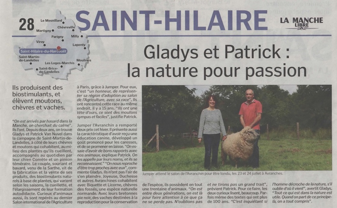 Gladys et Patrick Van Nuvel avaient rencontré le GONm sur un stand voisin du leur lors d'une fête bio dans le Cotentin. Suite aux échanges, ils ont choisi de faire entrer leur propriété dans le réseau des refuges. Outre leur activité originale basée sur l'extraction des biostimulants naturels des plantes, ils élèvent des races particulières (pie noire bretonne, mouton de l'Avranchin - Pensez aux tricots de laine de la célèbre marque locale : Saint-James! - , chèvre des fossés) avec cette particularité que les animaux domestiques ont développé une relation de confiance remarquable avec l'homme. Le taureau vient de faire gratter la tête avec un plaisir évident quand Patrick l'appelle!