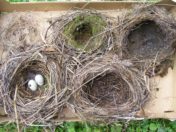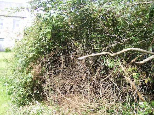 Le démontage manuel tige par tige d'un roncier a permis de repérer les nids. Ils sont tous dans la bande de 60 cm porteuse de feuilles de l'année : pour une bande circulaire de 9 m de long sur 2 m de haut, 2 nids de merle, 1 de grive musicienne, 2 d'accenteur et 1 de fauvette à tête noire. Quelques orties dépassent le roncier, hautes de 2,6 m!