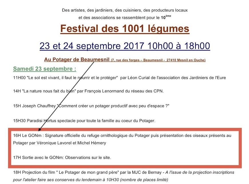 Samedi 23 septembre, dans le cadre du festival des 1001 légumes, la convention (n° 300!) sera signée à 16 h, heureuse suite de l'implication locale de nos collègues Véronique Lavorel et Michel Hémery, administrateur du GONm. Une sortie ornithologique est proposée à 17 h. De nombreuses autres activités sont proposées au cours du week-end.