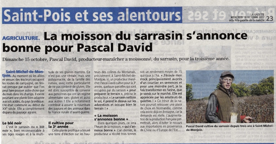 Cette parcelle dédiée au sarrasin est vraiment caractéristique des terres acides des landes armoricaines. Quelques secteurs en déprise retrouvent une flore typique de genêts, d'ajoncs et c'est là que lors des relevés le traquet pâtre, le bruant jaune, l'hypolaïs polyglotte et la linotte sont notés. Ce que ne dit pas l'article, c'est que David et Elisabeth cultivent et commercialisent légumes, pommes et céréales (et les oeufs qui en découlent) en bio. Et donc aussi du blé noir bio! Les granivores locaux apprécient...