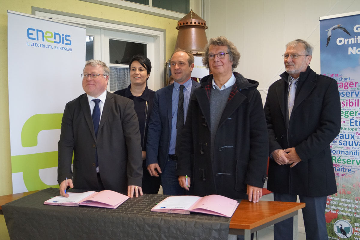 Cette signature s'est faite entre le délégué territorial d'Enedis, H. Wattiez et le président du GONm, G. Debout, en présence et sous le patronage de Madame la Ministre E. Grellier, secrétaire d’État chargée des collectivités territoriales, de J. Dellerie, député, de nombreux élus et, particulièrement, C. Lethuillier, maire de la Poterie - Cap d'Antifer et, aussi, conservateur de la réserve GONm du Cap d'Antifer qui nous a accueillis au phare d'Antifer pour cette signature.