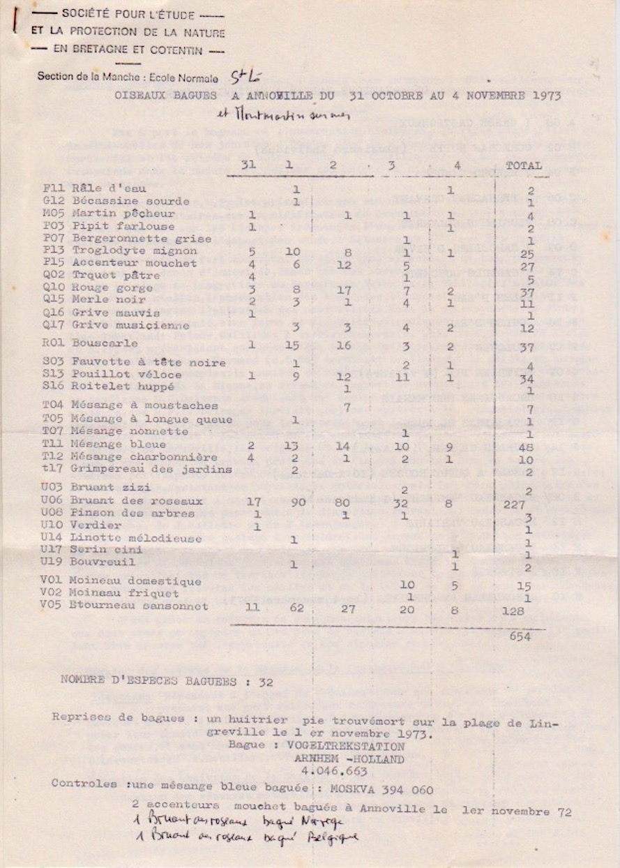 - CR baguage par Lucienne Lecourtois. Les sites en marais (dont Hauteville, Annoville) apportent leur lot d'espèces paludicoles (bouscarle, bruant des roseaux) et quelques surprises (bécassine sourde, martin-pêcheur, râle d'eau...) Etonnant, 2 accenteurs contrôlés, bagués l'année précédente au même endroit!)