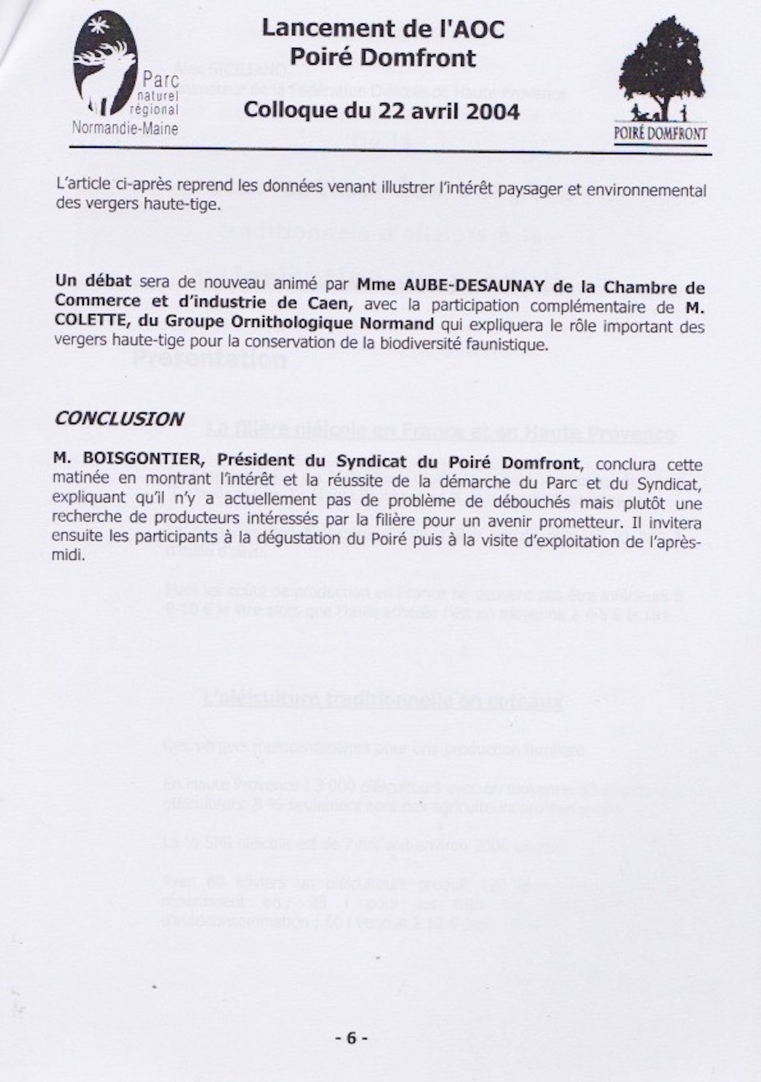 Le programme de cette manifestation officielle résume à la fois l'historique et les enjeux de la démarche qui aboutit à cette AOC "Poiré Domfront". Le PNR s'est largement investi dans l'opération et il faut rendre hommage à cette structure qui a aussi déployé beaucoup d'énergie dans la promotion des programmes de replantation après les cruelles destructions de la tempête de décembre 2000. 2008 06 00 - avifaune du verger - synthèse- le Cormoran -
