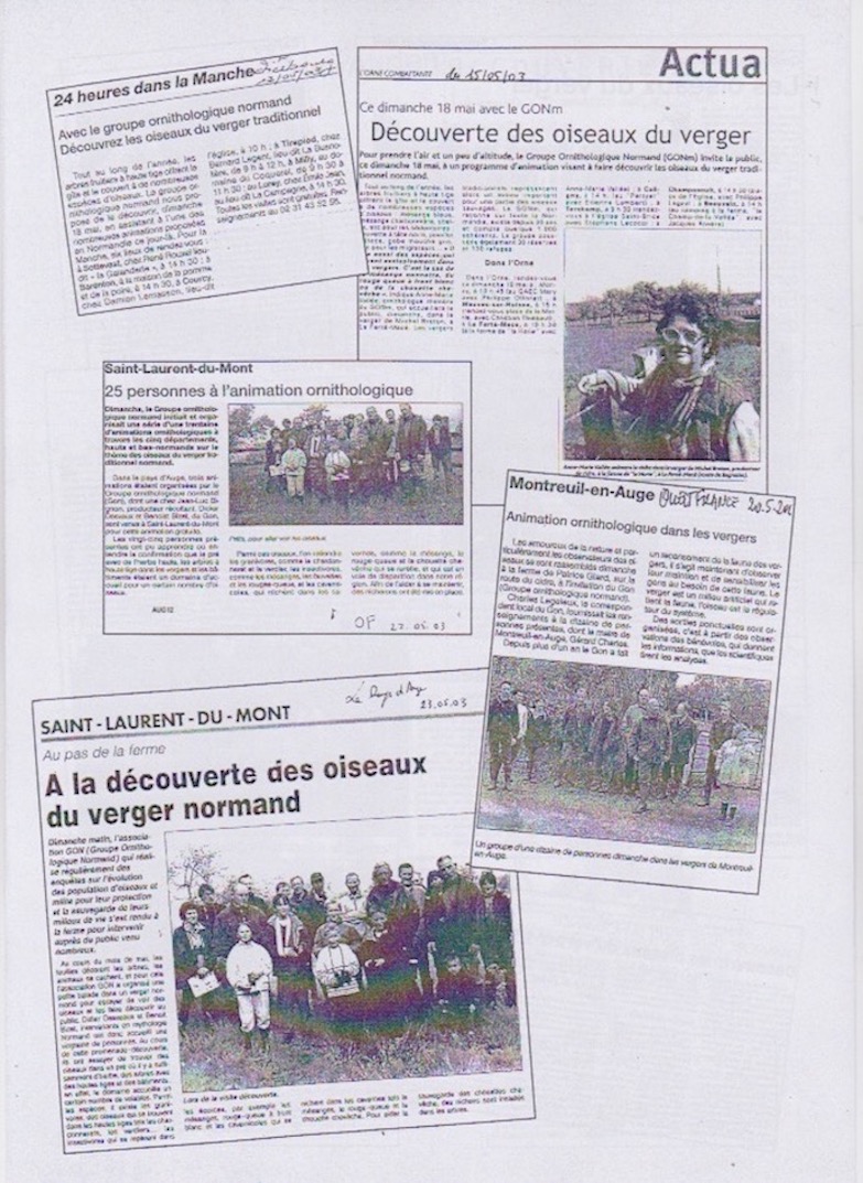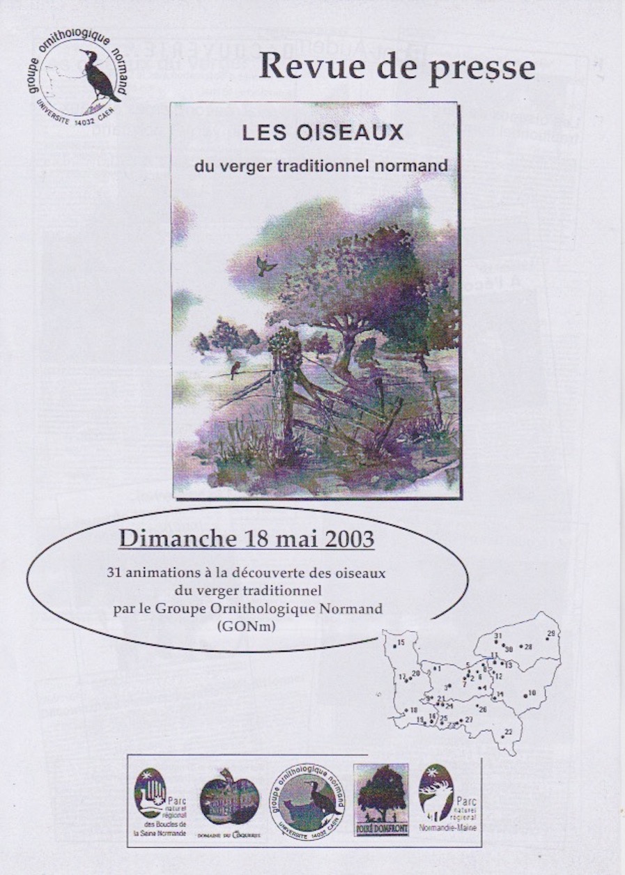 Une première rencontre organisée par Philippe Pointereau (SOLAGRO) à St Fraimbault le 15 mai 2003 permet de faire le point sur l'histoire et l'évolution du verger en Normandie. Le GONm est représenté par Charles Legeleux et Jean Collette. Les données de diverses études sont rassemblées dont celles récentes des comptages comparatifs de 2002. 2003 05 15 - avifaune- verger - restitution - PNR NM - Saint-Fraimbault -