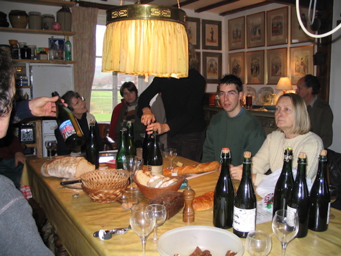 Plus localement, à l'occasion d'une journée (très pluvieuse) "plessage" sur le refuge de Pont-Farcy, les participants avaient été invités à venir avec une bouteille de cidre de leur secteur d'origine, d'où la dégustation à l'heure du repas à la table de Sarah et Christopher Long qui nous accueillaient. (Je me souviens encore du cidre de Christian Noël du Mesnil!)