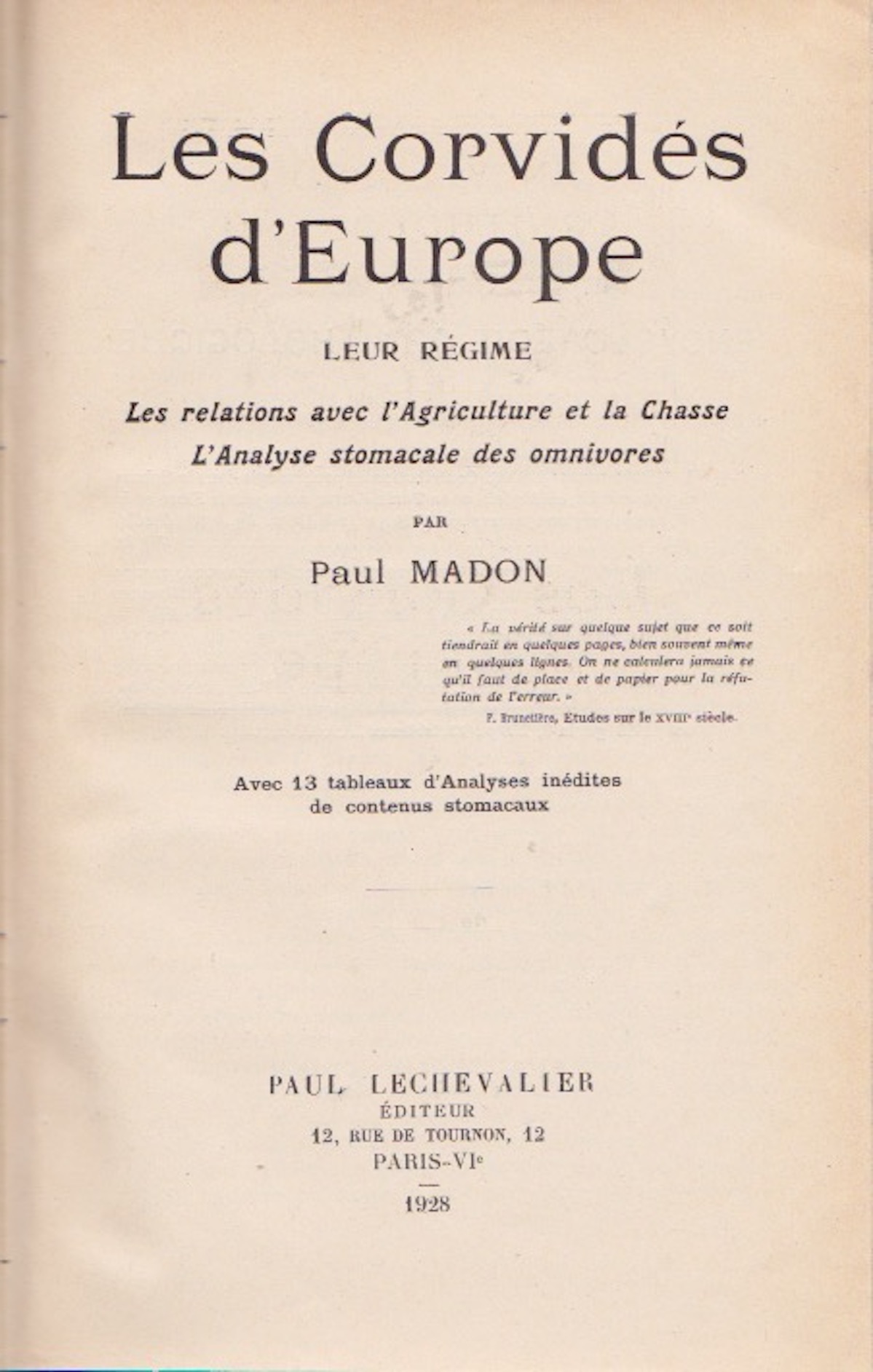 Le fond du débat n'est pas récent. Les ornithologues du 19e siècle ont essayé de trouver des arguments objectifs pour trancher la question de "l'utilité" des espèces. L'exemple mis ici en avant est typique de l'analyse de milliers de contenus stomacaux de cadavres, de pelotes. Madon pose d'emblée la question de la véracité des avis exprimés par des spécialistes : pour lui, le corbeau freux est bien plus "nuisible" qu'utile. Rappelons aussi qu'au 19 e siècle, les terres sont majoritairement cultivées partout où c'est possible. Il faut donc admettre que notre vision actuelle ne correspond pas forcément au vécu de nos aïeux. Par contre, le développement actuel des labours remet à l'ordre du jour la concurrence de ces glaneurs de semis...