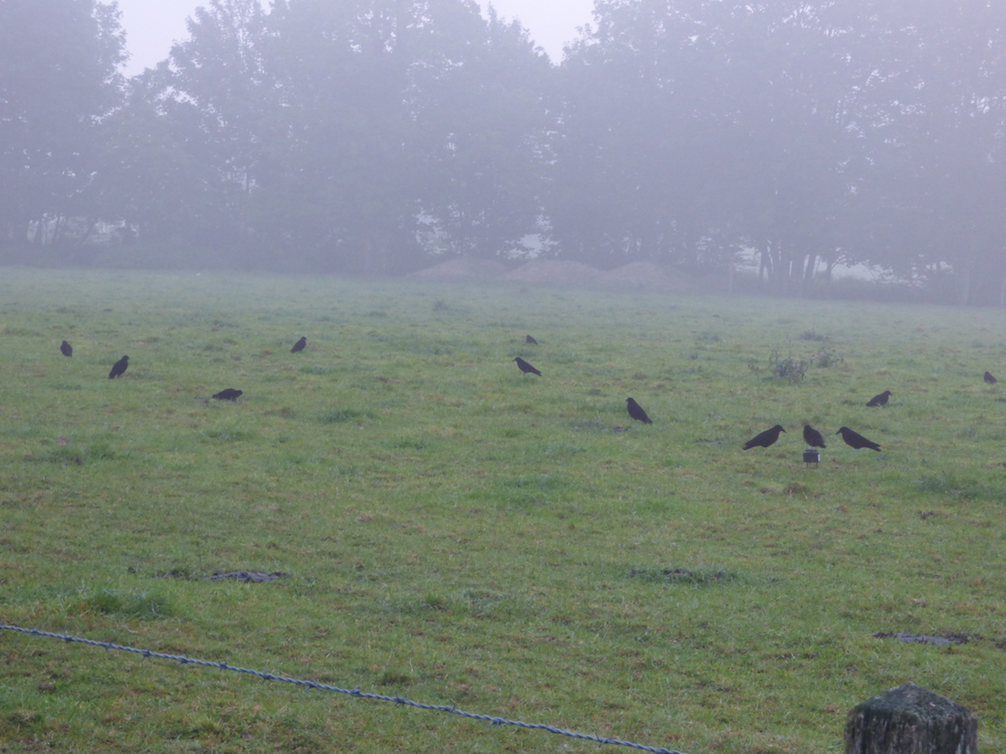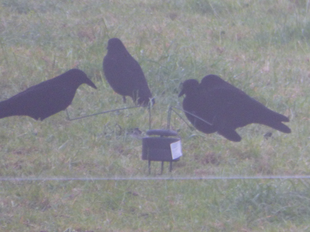 Mi mai, époque des semis de maïs dans le sud Manche. Sur une prairie proche d'un labour, des corvidés noirs dispersés immobiles et quelques individus qui tournent les uns autour des autres à intervalle régulier... Leurre assez efficace vu les quelques coups de fusil que j'entendrai durant l'heure de relevé sur le terrain sur l'échangeur de l'A84 que je suis.
