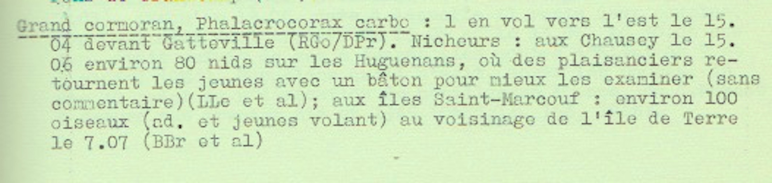 L'image du grand cormoran au nid s'imposait : le déclin national de l'espèce avait alerté les ornithologues normands à l'époque. "Le Grand Cormoran au nid qui illustre la couverture de ce bulletin a été dessiné par F. Bazin, d'après une photographie prise par M. Brosselin le 2 juillet 1967 aux îles Saint-Marcouf (Manche)." Le Cormoran, 1: 6 - chronique ornithologique mars-août 1968 - grand cormoran