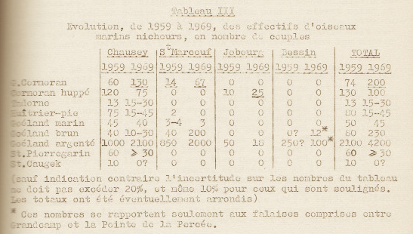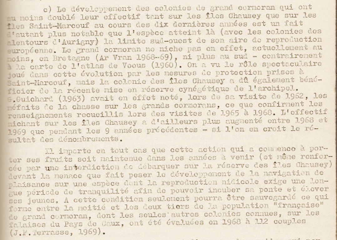 B. Braillon fait le point sur les 10 premières années de décomptes, se félicitant du résultat des premières mesures de protection (chasse). Mais la plaisance autour de Chausey reste une préoccupation majeure en 1969. Le GONm peut-être satisfait de l'évolution de la réglementation qui aboutit à une meilleure protection des colonies d'oiseaux marins nicheurs. Actuellement (informations G. Debout), le débarquement sur les ilots de Chausey est interdit sauf de mi juillet à septembre; sur Saint-Marcouf, le débarquement sur la réserve est interdit par arrêté préfectoral mais aussi la navigation et le mouillage autour de la réserve.