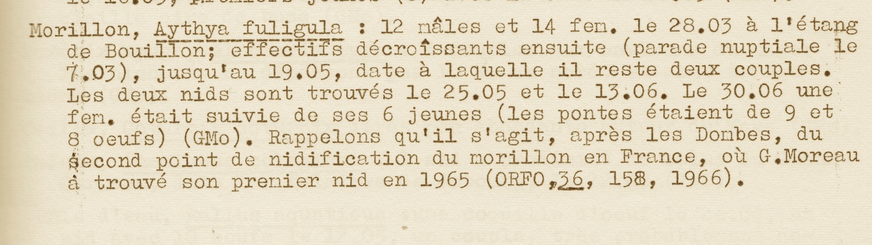 Gaston Moreau est un riche contributeur mis à l'honneur par Bernard Braillon dans son introduction : "... G. Moreau qui , depuis de nombreuses années déjà, étudie l'avifaune du sud-est de l'Orne (et détient le record des découvertes de nids)..." L'exemple en est donné avec la citation concernant la nidification du fuligule morillon. Si l'espèce n'est plus maintenant un nicheur rare en Normandie (quoique très localisé cependant), en 1968 c'est la seconde donnée de nicheur en France!