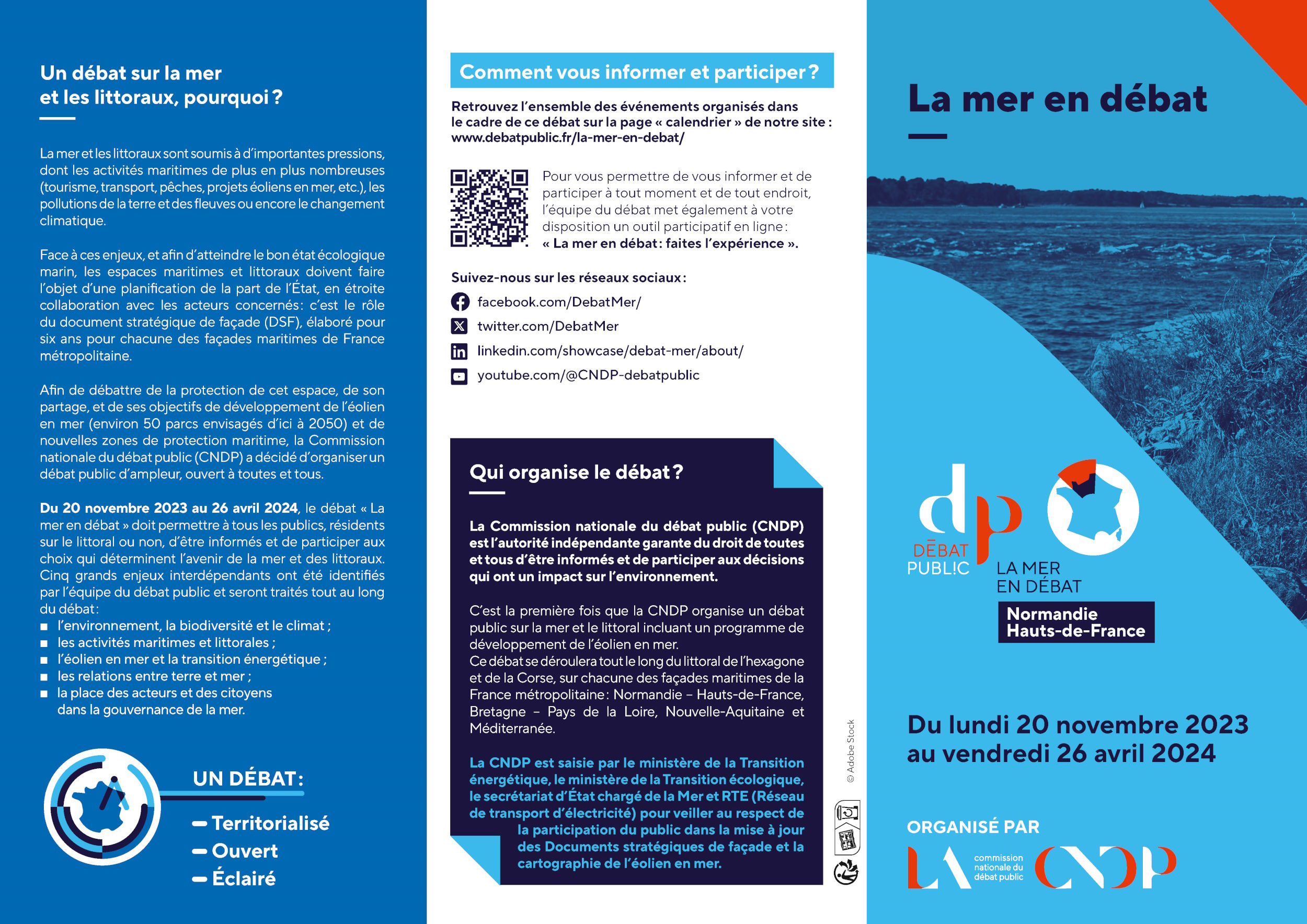 La Commission nationale du débat public (CNDP) organise un débat d’ampleur « La mer en débat » du 20 novembre 2023 au 26 avril 2024.