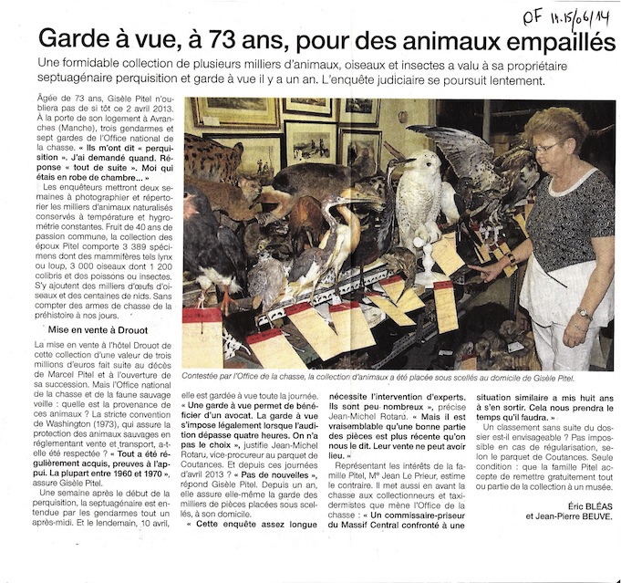 Le titre de l'article de Ouest-France accroche l'oeil vu l'âge de la personne! Le fond du problème reste : comment régler le problème des animaux naturalisés "obtenus" par des particuliers souvent/parfois à la limite de la légalité? La question s'est déjà posée dans le Sud Manche avec la collection de Louis Lepaumier qui avait installé un musée de la nature à Champeaux, dans les mêmes conditions (saisie des pièces par l'ONCFS) après avoir exercé durant de nombreuses années la profession plus ou moins déclarée de taxidermiste à Montgothier près d'Isigny-le-Buat.