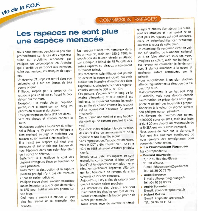 Un article de mars 2016 qui reprend le cours des choses d'avant le DDT (Dichloro-Diphenil-Trichloroéthane, pour la poésie )... ça rajeunit les plus vieux d'entre nous de 50 ans, quand les pigeons de course devaient aller plus vite que les faucons pèlerins à leurs trousses, redoutable sélection naturelle! A cette époque, le fait d'arme le plus réputé (et légal) pour un garde-chasse privé normand était d'abattre un autour. Sauf erreur, les rapaces n'ont été protégés en France qu'en 1972.