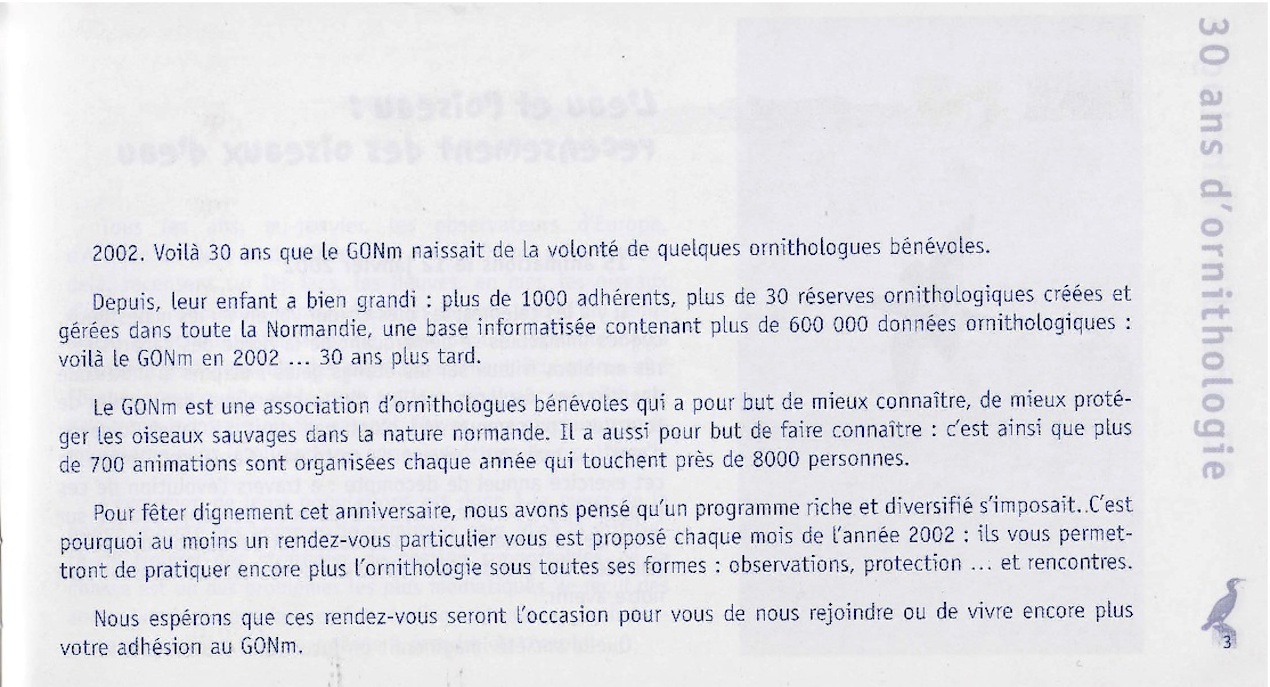 En 2002, le GONm fêta le dépôt de ses statuts, 30 ans plus tôt en novembre 1972. Une série d'évènements mensuels marqua cet anniversaire, mis en valeur grâce à l'édition d'un fascicule de la série des éditions du Cormoran. Le financement du tirage fut pris en charge par deux entreprises du sud Manche dont le dirigeant, Michel Mangeas, était adhérent du GONm à travers le réseau des refuges. En 2019, l'entreprise Mangeas est toujours fidèlement adhérente de notre association.