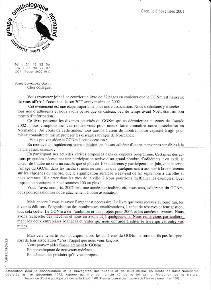 Quelques documents pour illustrer les relations anciennes entre le GONm et l'entreprise Mangeas (sablières à Ducey/50). A diverses occasions, nos données ont participé à la construction de dossiers administratifs sachant qu'il était de l'intérêt de l'avifaune que nous appuyions les choix de l'entreprise dans le sens des orientations écologiques favorables à la biodiversité.