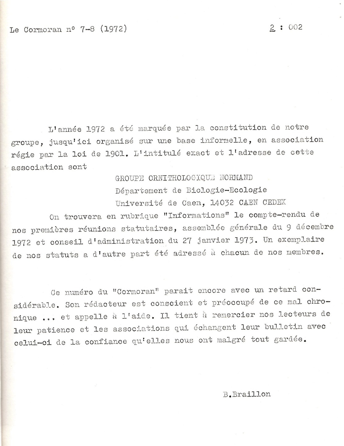 BRAILLON B. (1972) : Editorial. Le Cormoran, 2 : 002.