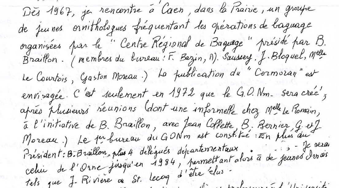 Les souvenirs de G. Moreau concernant la création du GONm. Mlle Le Romain chez qui se tient la réunion dont il est question est la logeuse de Bernard Braillon, alors célibataire. Mlle Le Romain prendra part à la vie du GONm en tenant le rôle de trésorière quelque temps. Sa tendance à déborder de ses attributions administratives provoquait parfois "l'irritation" de B. Braillon... J'ai le souvenir d'une réunion du CA au musée de la nature à Caen où il fallut que je "m'empare" de la présidence de la séance pour aplanir l'ambiance devenue conflictuelle!