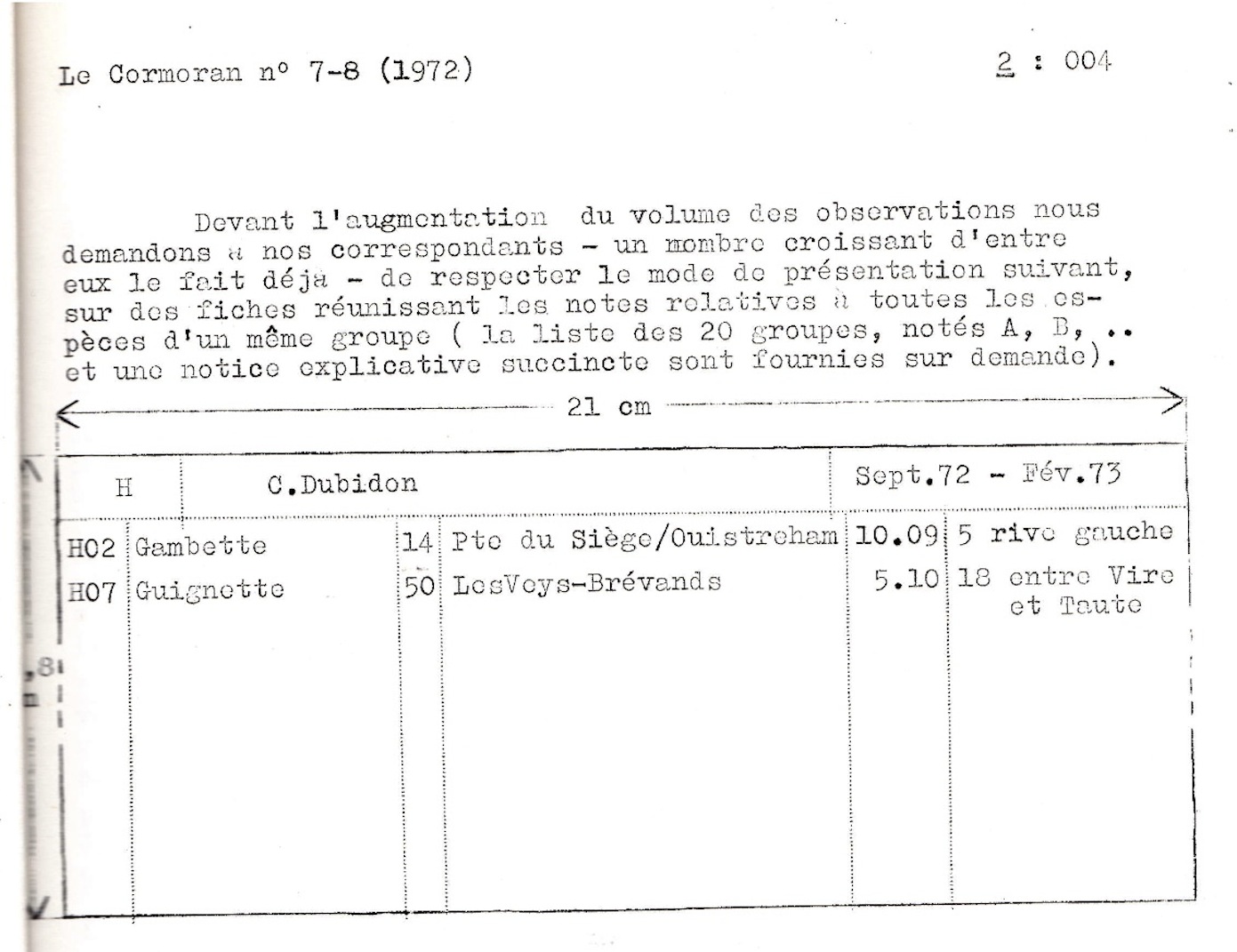 La mise en commun des observations impliqua rapidement une certaine discipline de groupe : B. Braillon fut l'homme de la situation. Perfectionniste et organisé, il mis au point des fiches que les observateurs remplissaient deux fois par an en septembre et en mars. Ces fiches, les "RSS", étaient ensuite partagées entre les responsables des différents groupes d'oiseaux, d'abord pour les synthétiser par espèces et chronologiquement (les "BSS", bulletins saisonniers systématiques), puis pour rédiger des synthèses à paraitre dans la chronique du Cormoran. Autant dire que cette cascade de mises en forme engendra souvent des retards d'édition... (C'est encore le cas en 2019 même si l'ordinateur permet de ranger rapidement les données.)