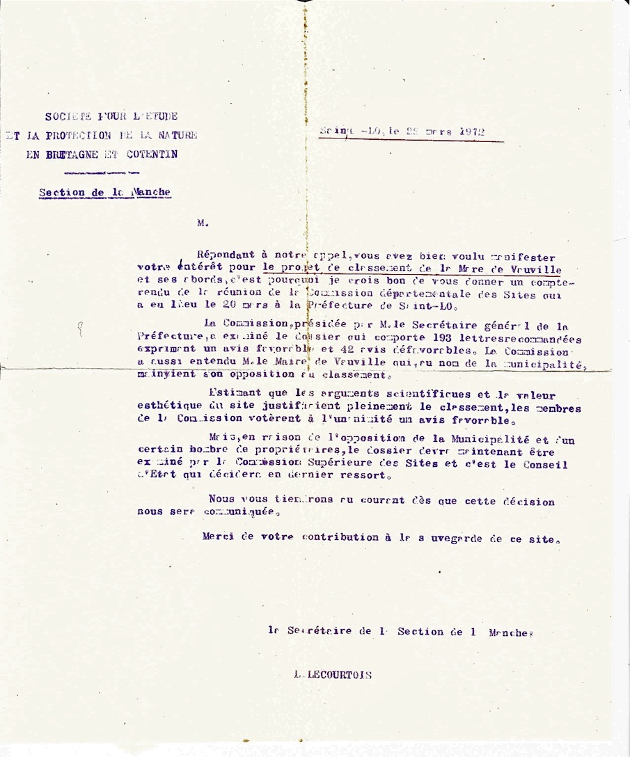 1972 03 22 - Vauville - mare - classement réserve - SEPNBC - Lucienne Lecourtois - L'idée que la mare de Vauville soit si exceptionnelle que le site mérite un classement en réserve ne va pas de soi en 1972! Le résultat de la réunion de la Commission des sites du 20 mars à Saint-Lô, rapporté par Mlle Lecourtois, donne pourtant l'avantage au classement (193 courriers "pour", 42 "contre"...) mais l'avis du maire de l'époque - et de propriétaires riverains - obligera l'administration à poursuivre la démarche à l'échelon national.