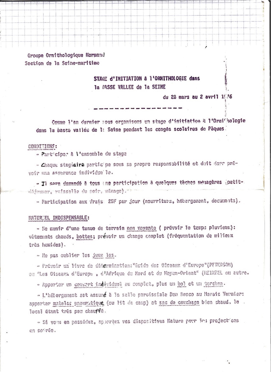 Le premier ciment des ornithologues normands fut le baguage quand le GONm ne s'appelait encore que Groupe ornithologique régional. Puis les stages de baguage intégrèrent l'observation, enfin des stages s'appuyant uniquement sur l'observation furent organisés. Ce second stage en Pays d'Auge fut probablement au moins en partie organisé par Bruno Dumeige, natif de Vimoutiers, à proximité donc de la commune d'Avernes-Saint-Gourgon.