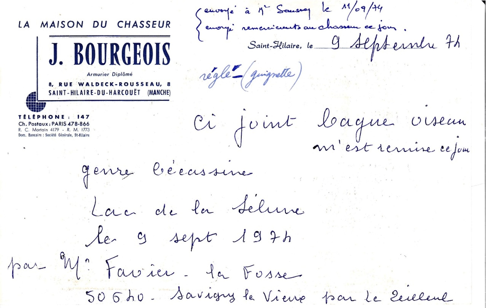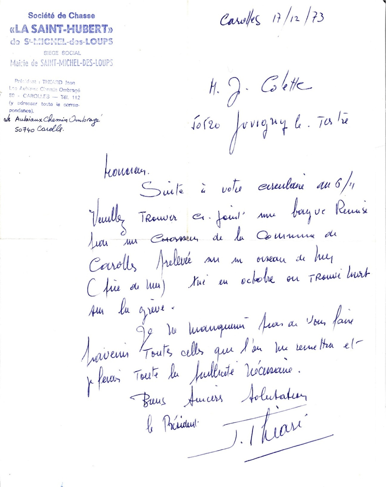 Le président de la société m'a envoyé une bague qui lui a été remise par un chasseur. Cette société a son siège à la mairie de Carolles. Autre temps autres moeurs, un peu plus tard les relations seront tendues avec la société de chasse lors de la mise en place de la réserve de Carolles...