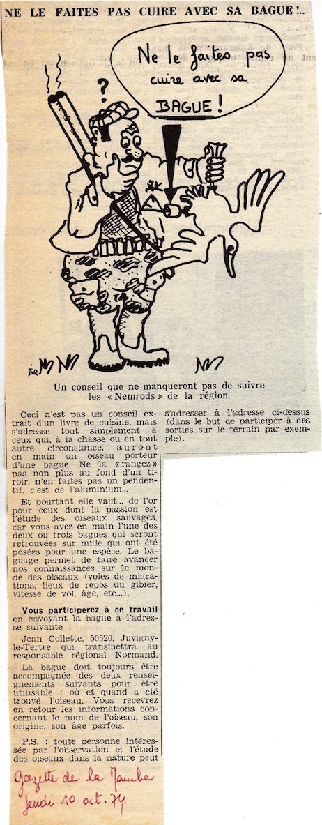 Message d'un temps où les hivers étaient rudes (ce sera pire de 1985 à 1987...) La presse publie sans problème ces appels destinés à retrouver les bagues portées par les oiseaux morts. On verra dans un message à suivre que les armuriers jouent le jeu aussi.