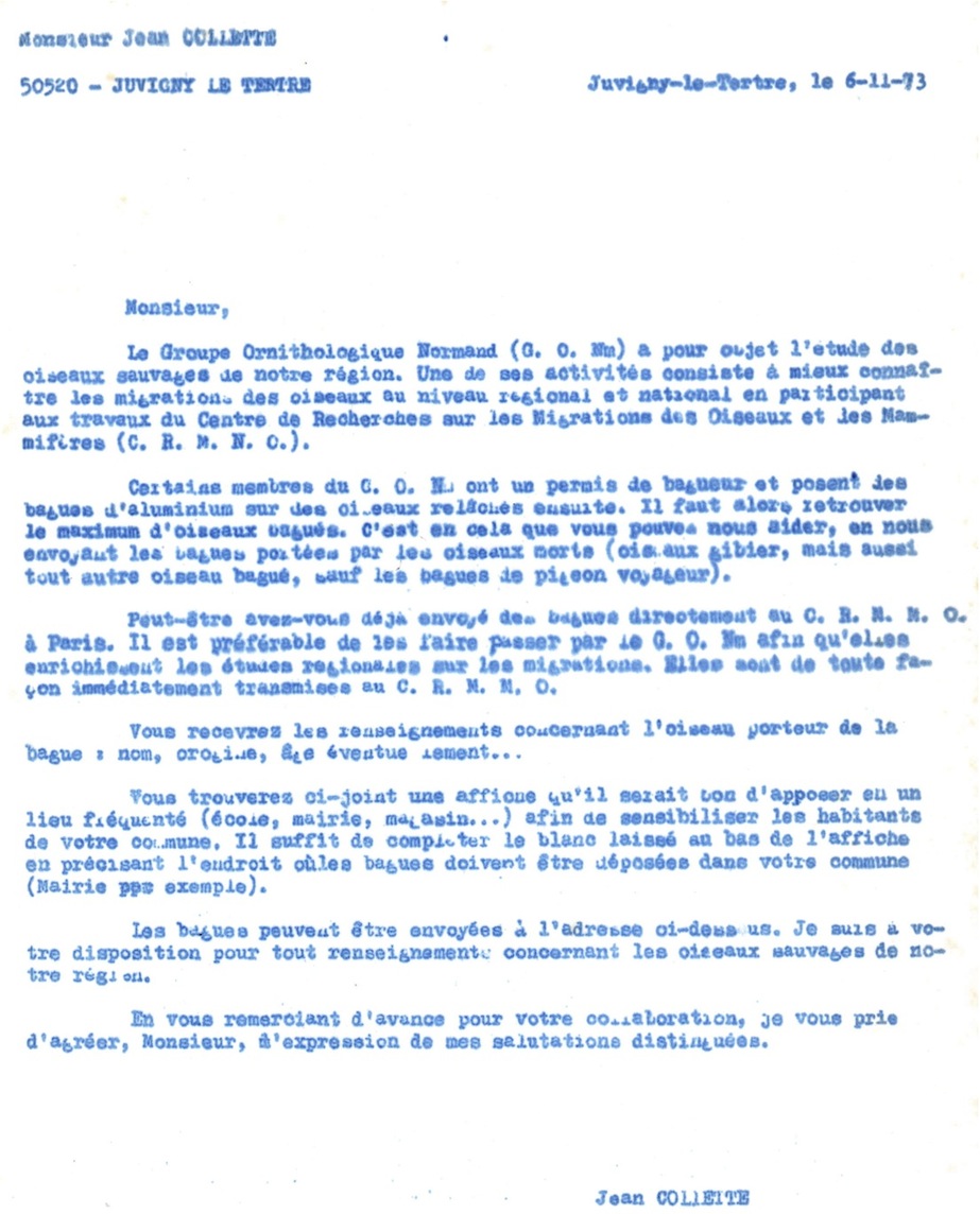 Un courrier (polycopié à l'alcool...) destiné aux mairies, armureries et lieux publics pour motiver la récupération des bagues trouvées sur les oiseaux morts dont le gibier.