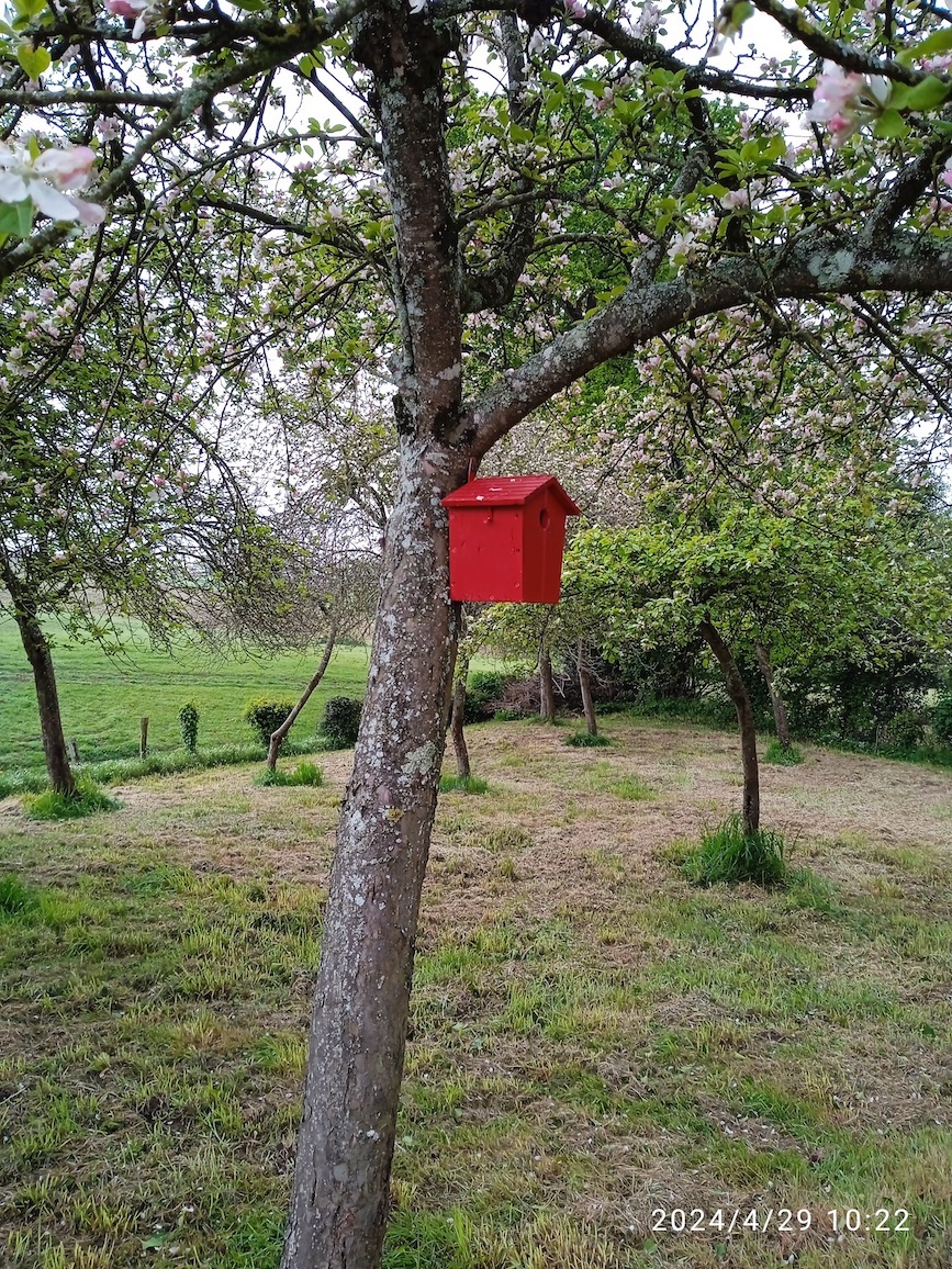 Son verger d'arbres fruitiers est fermé de haies basses et hautes (dont une qu'il vient d'acheter pour la mettre à l'abri des "aménagements" agricoles qui font fureur actuellement dans notre secteur...). Le rougequeue à front blanc chante chez le voisin (beaux bâtiments à murs de pierre, gîte assuré pour le nid) et la bouscarle se manifeste en bas dans la prairie en déprise le long du ruisseau. Une partie des fruitiers est ancienne et porte diverses plaies comme le montrent quelques photos. Les cavités sont largement disponibles. Pierre a construit 3 nichoirs posés dans le verger. Tous occupés ce mardi 30 avril, mésanges bleues et charbonnière. Au passage, on vérifie que les oiseaux ne sont pas gênés par la couleur rouge, mais aussi que le nichoir artificiel attire plus que la cavité naturelle quand le choix est offert aux mésanges... Mais le raisonnement ne vaut pas pour les invertébrés de l'humus au fond des cavités des arbres creux. Un vieux noyer a aussi connu des vicissitudes...