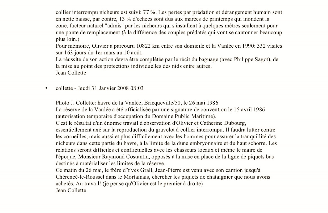 Au milieu des années 1980, on peut encore circuler en automobile au coeur du havre. Le traquet motteux est un nicheur bien installé dans les nombreux terriers de lapin dans les dunes et le GCI niche sur les zones sableuses basses (et inondables lors des grandes marées) du marais intérieur. Olivier Dubourg et sa femme suivent la colonie de gravelots et il s'avère que la circulation est destructrice de nids (mais pas seulement, les corneilles poseront un problème). D'où des démarches pour soustraire une partie du havre au passage des véhicules - dont ceux des chasseurs au gibier d'eau, ce qui ne facilitera pas les démarches...