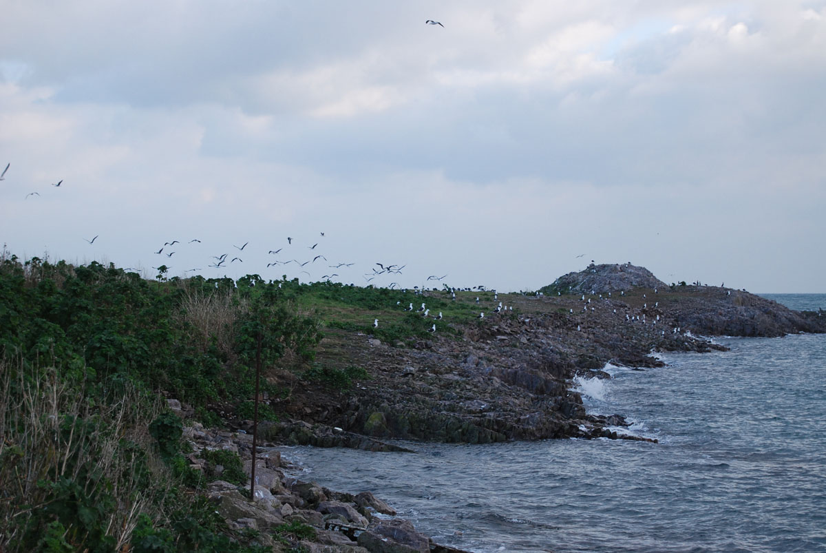 tout comme plusieurs centaines de goélands cendrés en mer près de l'île.