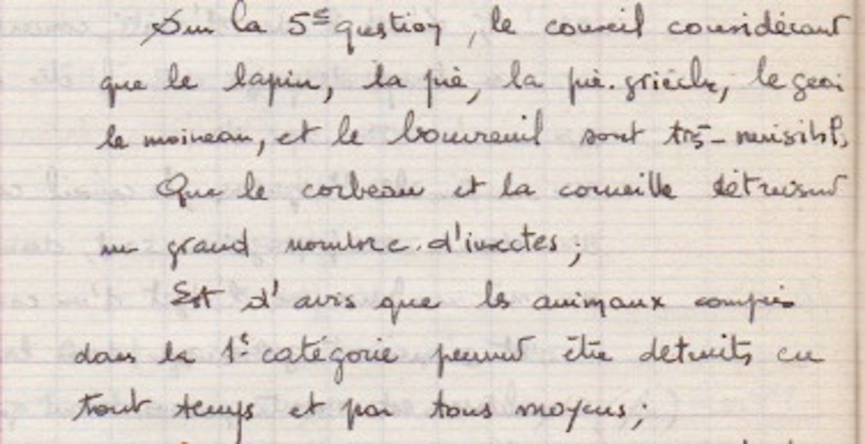 La liste des animaux nuisibles est acceptée : "le loup, le renard, le blaireau, la belette, le putois, la martre, la loutre et les oiseaux de proie en général. Sont également compris dans cette catégorie mais seulement durant les semailles et un mois après, le corbeau et la corneille, la pie et la pie-grièche." La discussion porte sur des additions. Le statut du bouvreuil ("très-nuisible") ne prête pas à discussion... Par contre, dans sa réponse, le conseil rappelle "que le corbeau et la corneille détruisent un grand nombre d'insectes" et "que rien ne doit être changé à l'article 2 de l'arrêté en ce qui concerne le corbeau et la corneille." On aimerait que cette clairvoyance soit encore de mise : le statut des corvidés - y compris celui en discussion du choucas pourtant encore protégé - ne tient plus compte des 'services rendus" en dehors de la période des semis.