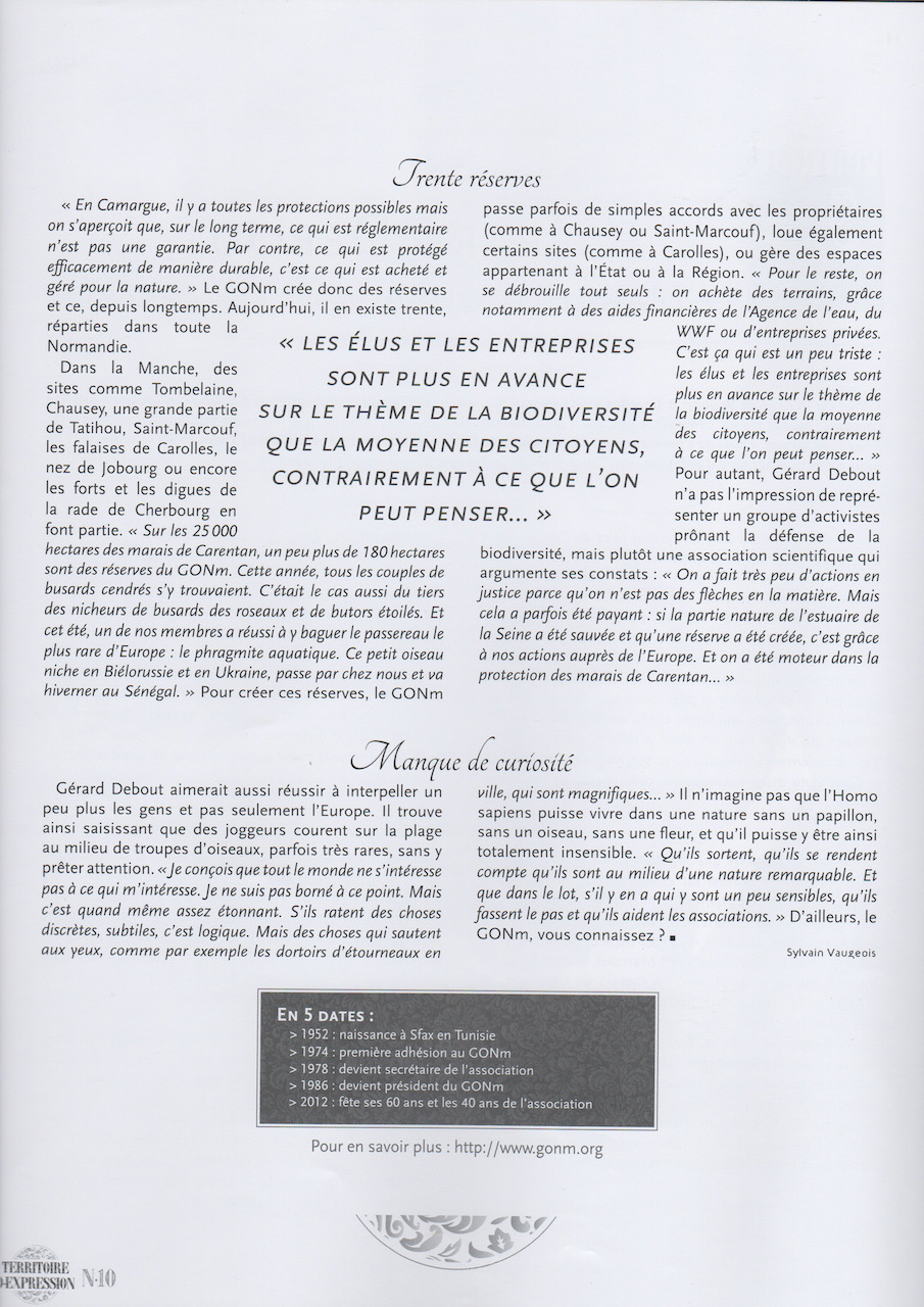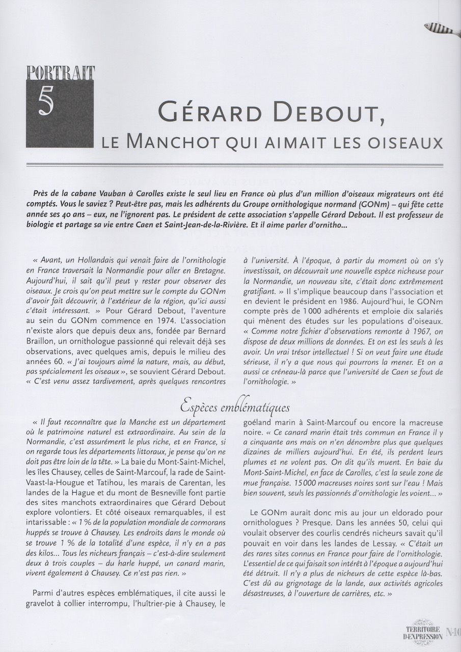 En 2013 paraissait le n° 10 de Territoire d'Expression, revue de la Manche dans lequel Gérard était l'un des dix portraits de ce numéro dans lequel il parlait du GONm, des espèces emblématiques de Normandie, de nos trente réserves de l'époque et du manque de curiosité du public pour la nature.