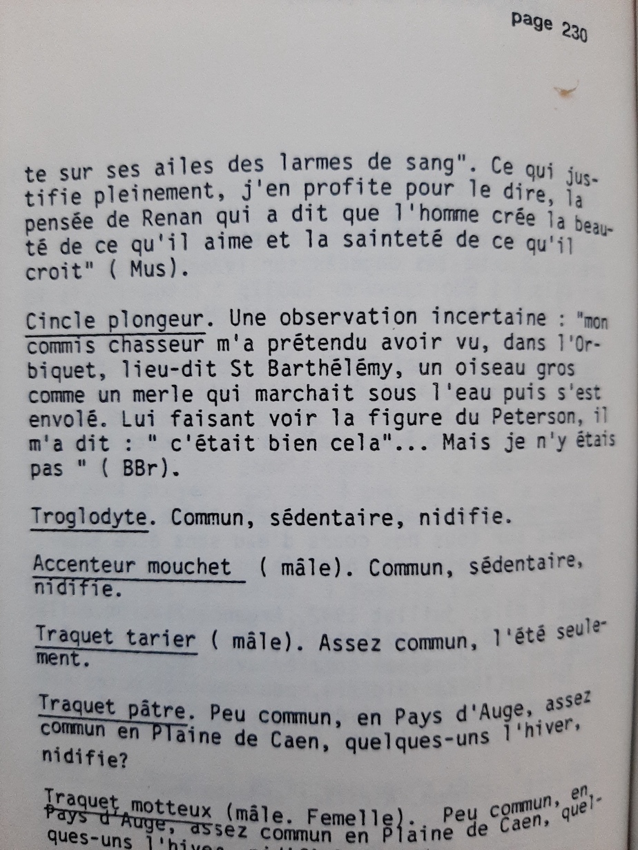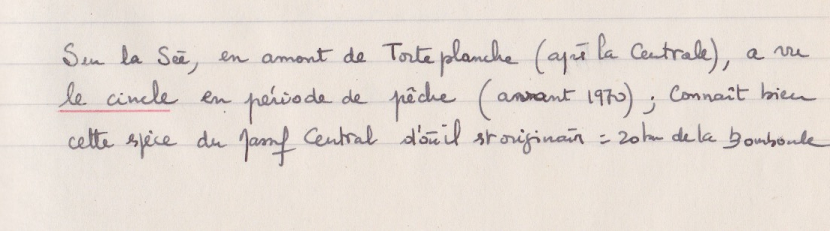 CRUON R. (non daté!)- Bibliographie ornithologique de la Normandie. p 179. Suite à l'enquête sur l'avifaune de la vallée de la Sée, j'avais recueilli le témoignage de quelques personnes dont celui d'un observateur digne de confiance, Monsieur Paul Espinasse (22/09/1994), habitant Sourdeval/50, pêcheur de truites originaire du Massif Central et connaissant parfaitement le cincle. Le secteur de la Sée dont il parle ici est particulier : la vallée (nommée localement "vallée de Brouains") très encaissée dans les roches dures donne un caractère torrentueux au cours d'eau. Monsieur Pigeon habite les Isles à Chérencé-le-Roussel/50, au débouché de la vallée de Brouains. Interrogé le 15 septembre 1994 dans le cadre de la même enquête, il cite le cincle à deux reprises : "un vu au printemps dans le pré à Bouillet (en aval des Isles) vers 1950-55 et un autre sur le bief vers 1975."