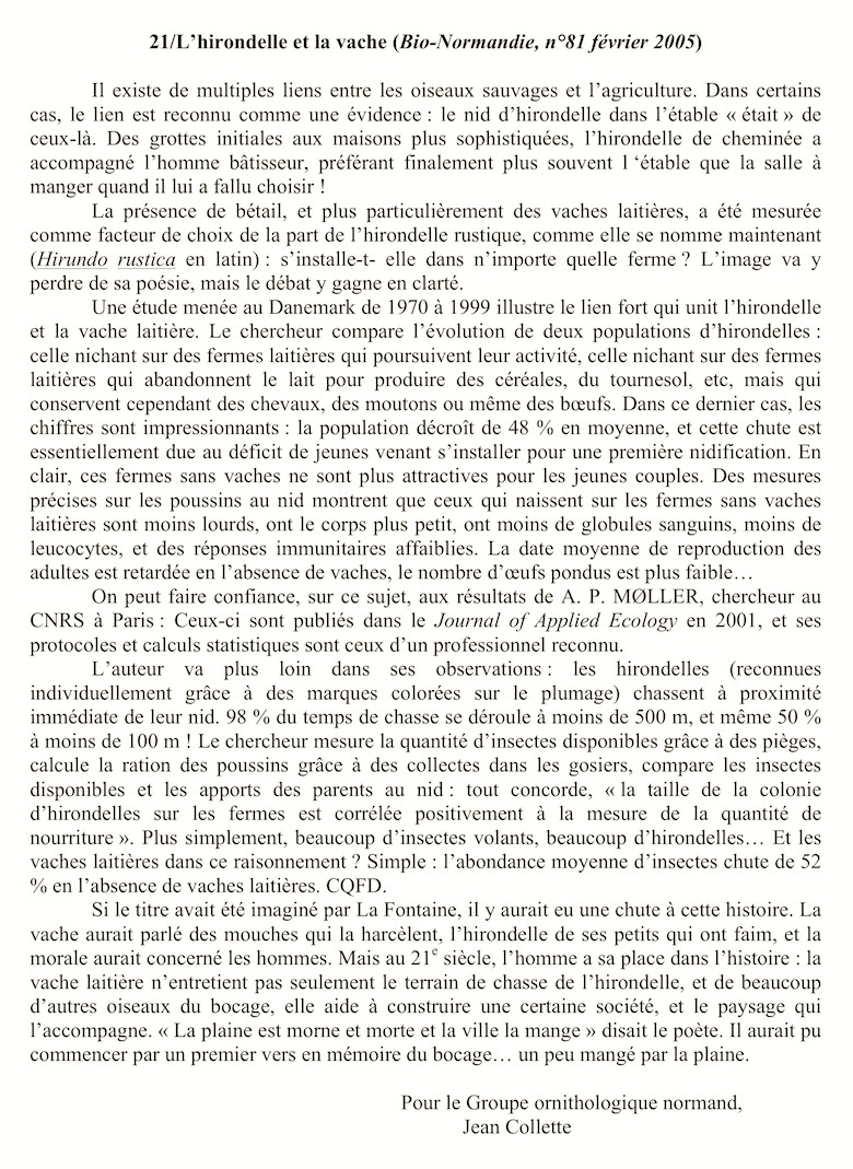 2005 02 00- Hirondelle rustique-vache laitière-Bio-Normandie n°81-[/b Le nombre de vaches laitières ayant considérablement augmenté en Normandie depuis les années 1950, la logique voudrait que le nombre de mouches et donc d'hirondelles rustiques suive la même courbe. C'est plus compliqué...