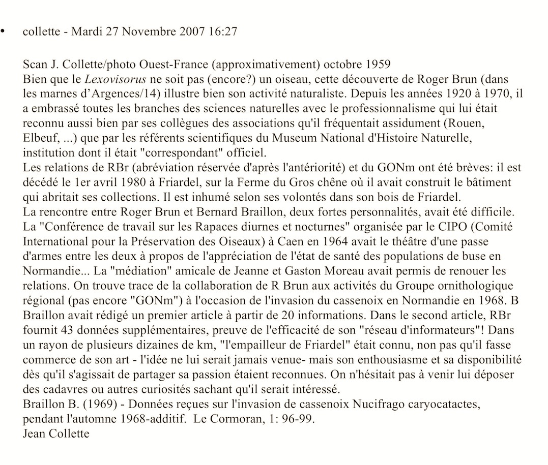 Il n'y a pas de rubrique nécrologique sur ce forum, simplement parce que lorsque l'un de nous décède, sa mémoire reste attachée à la vie archivée de l'association. C'est le cas de Monsieur Rousselle. Il résidait à Servon, dans une région de prairies humides dont il connaissait bien l'avifaune avant leur "mise en valeur" agricole .