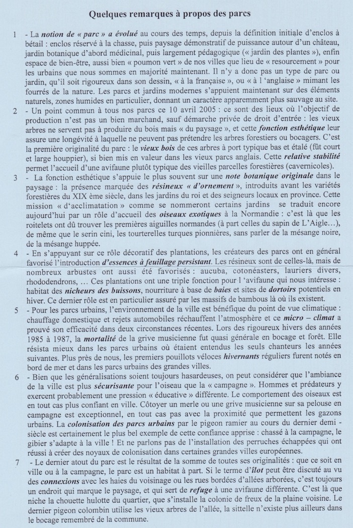 Après les deux journées d'animations concertées précédentes (oiseaux des vergers en 2003 et oiseaux des fermes en 2004), un nouveau thème est proposé pour la 3e année : les oiseaux des parcs. Deux difficultés vont apparaitre : qu'est ce qu'un parc? Et comment lever le doute sur la dénomination en lien avec les "parcs naturels régionaux"? Il faudra persuader les collègues que bien des sites peuvent prétendre à la définition et que nous n'habitons pas tous près de Versailles!