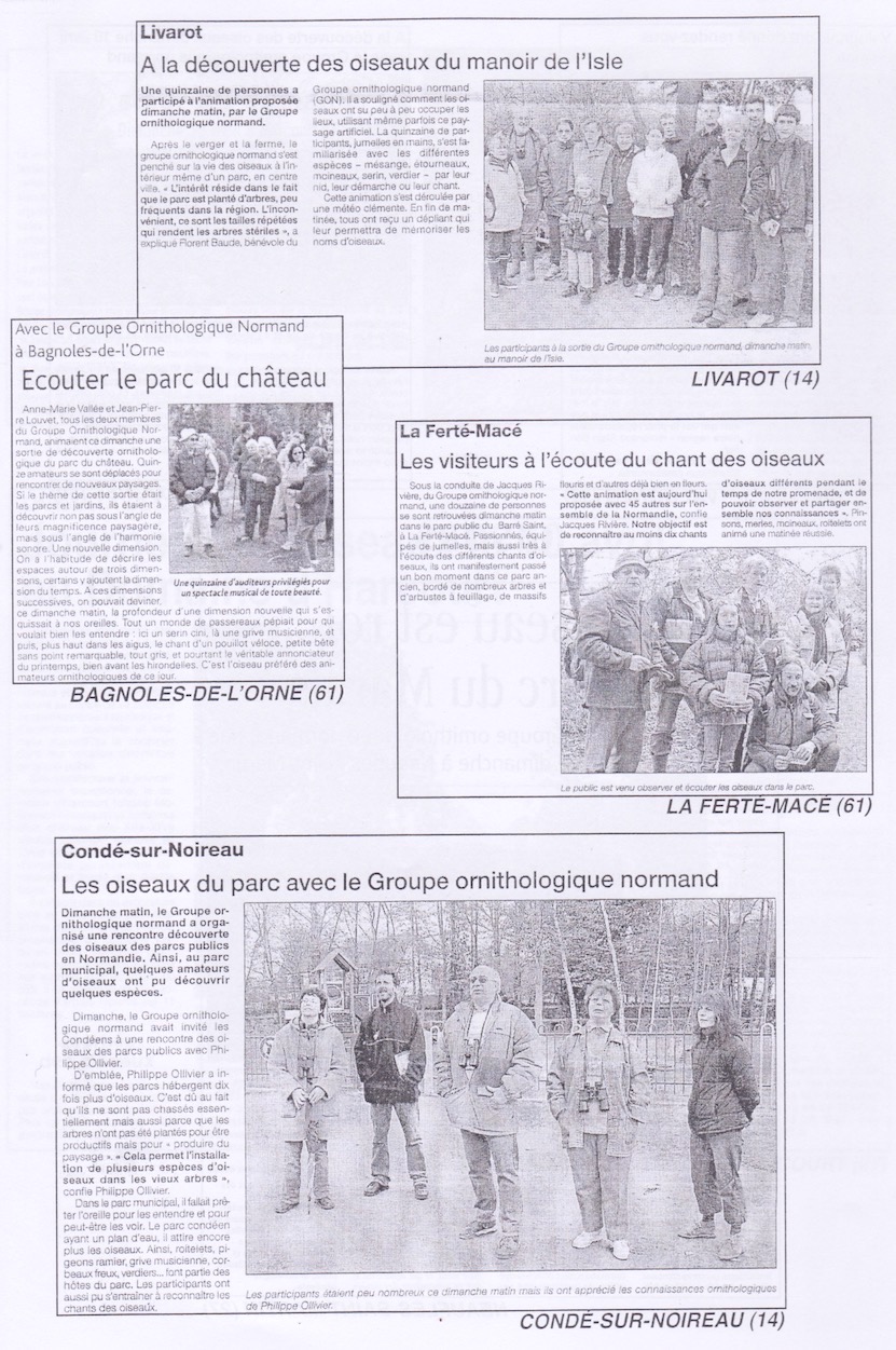 Février 2022 marquant les 10 ans de fonctionnement de ce blog, la date anniversaire donne l'occasion de faire le point. D'après les CR, 110 sorties ont été rapportées (Il y a parfois des animations estivales hors calendrier initial). Les 1911 participants ne donnent qu'une représentation partielle de notre "impact" pédagogique : ces sorties ont débuté bien avant 2012. En novembre 2018, nous avions "fêté" notre 3000e participant, total que j'avais reconstitué à partir de mes notes personnelles (je vous rassure, je n'ai pas les noms!) Le fait de pouvoir compter sur plusieurs animateurs nous permet de programmer ces sorties un an à l'avance : pour une date donnée, il y aura toujours bien l'un d'entre nous disponible! De plus, certaines sorties sont attractives, avec pour conséquence un "public" nombreux qu'il faut pouvoir fractionner en petits groupes. Ce fut le cas lors de la première sortie sur le refuge de la Bourdonnière à Saint-Martin-des-Champs : en janvier 2014, une cinquantaine de personnes étaient au rendez-vous! L'avantage de "disposer" d'un beau carnet d'adresses est de pouvoir réagir en dehors du calendrier prévu. L'animation prend parfois la forme d'une démonstration destinée à faire entrer l'ornithologie locale dans une démarche dépassant la seule reconnaissance des oiseaux. Par exemple, montrer rapidement en quoi les chaumes traditionnels sont importants implique de passer sur le terrain avant les machines! Il faut réunir immédiatement 5 ou 6 collègues disponibles, les résultats du comptage n'étant utilisables par la presse locale que si la photo de groupe appuie la démonstration. Ce fut aussi l'intérêt de la visite du verger haute tige de Tirepied quand le GONm se mobilisa pour une rédaction équilibrée du nouveau cahier des charges de l'AOC Cidre. Les animations mensuelles peuvent être l'occasion de mettre en avant certaines actions liées aux refuges ou aux réserves. Et quand la presse est là, "c'est double action"! Les réserves sont aussi mobilisées lors de certaines sorties. Visiter la réserve du Montier à Tirepied les pieds dans l'eau permet d'expliquer le fonctionnement de la crue et le rôle de la haie dans le ralentissement de l'inondation.