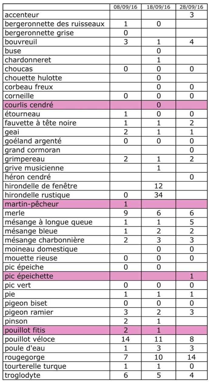 Trente espèces le 9, 28 le 19, 30 à nouveau ce matin.