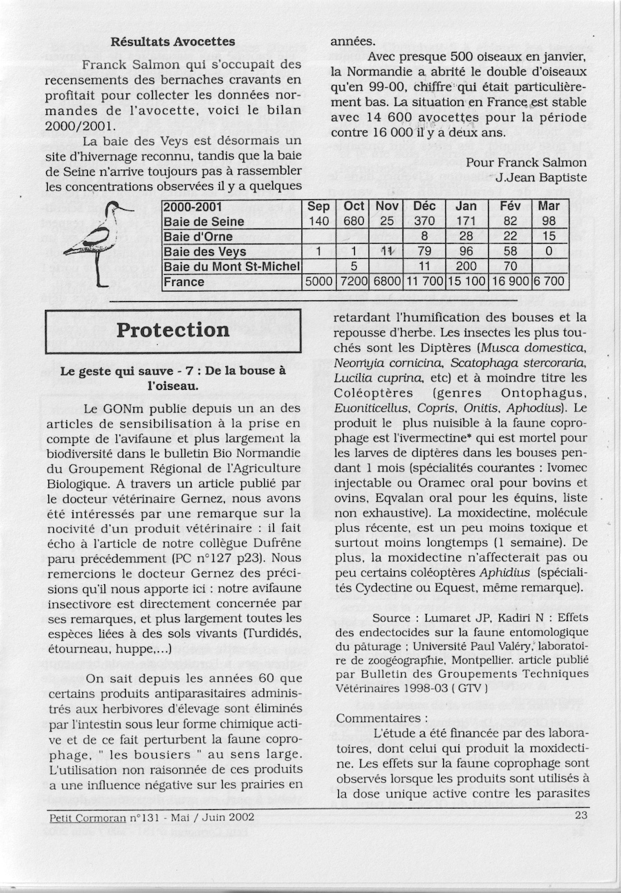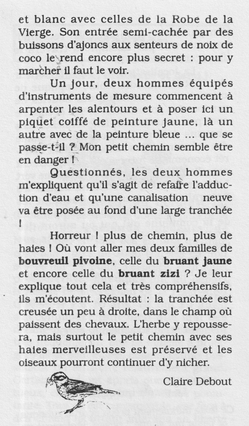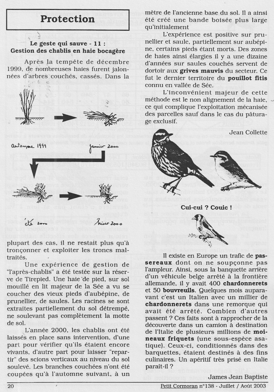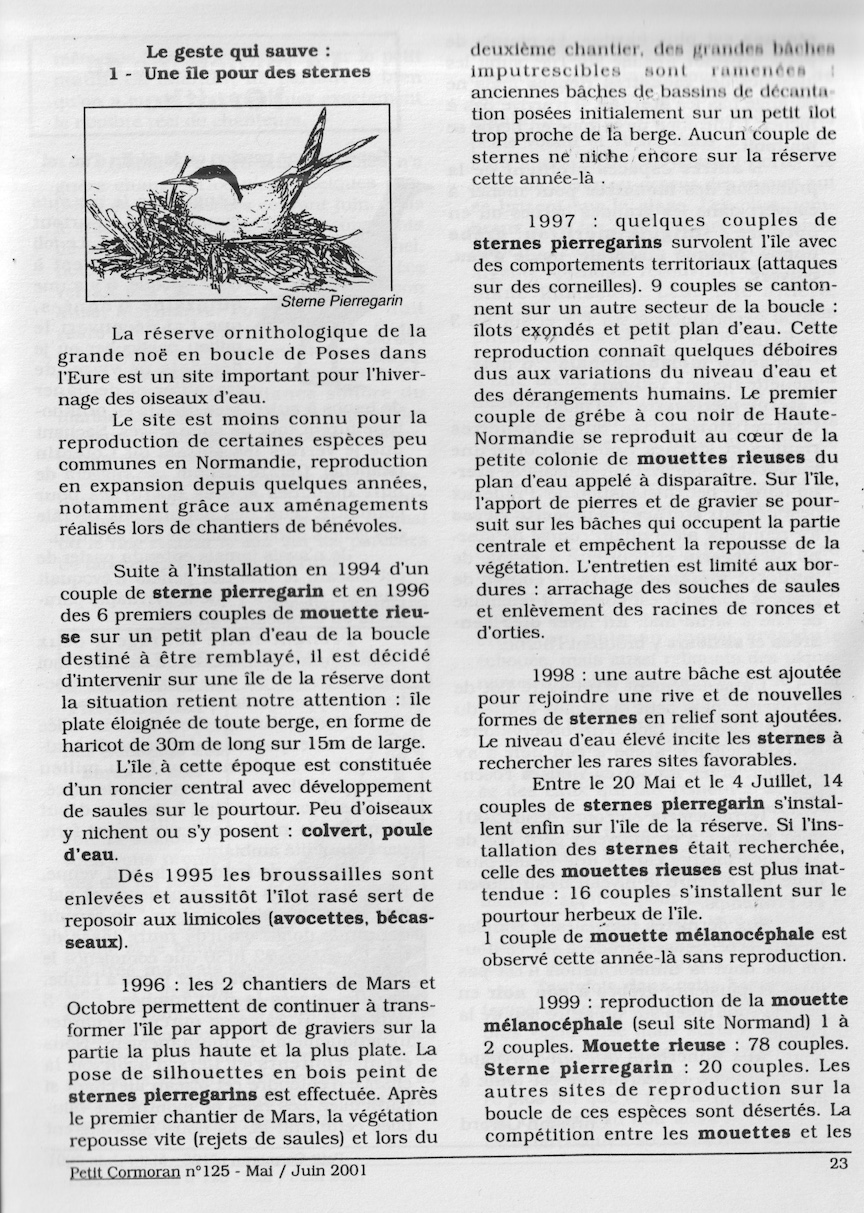 A partir de 2001, une rubrique plus ou moins régulière rapporte des témoignages ou des expériences en lien avec la protection des oiseaux ou des habitats. Cette expérience durera dans le temps avec tout le succès de nidification attendu en contrepartie de chantiers d'entretien répétés sous la houlette de Christian Gérard, conservateur de la réserve qu'il faut remercier ici, de même que tous les bénévoles et salariés dont Céline Chartier, qui ont participé à ces travaux d'aménagement. Thierry Lefèvre motive depuis longtemps les adhérents du GONm pour la pose de nichoirs destinés aux rapaces dont il est certainement l'acteur le plus actif. Il gère aussi le fichier des résultats. La question de la lutte antiparasitaire du bétail est probablement une cause majeure de disparition de nombreuses espèces liées aux gros insectes (bousiers) de même que celle du comblement des mares (dytiques, libellules et autres) : pie-grièche, chevêche, huppe,...